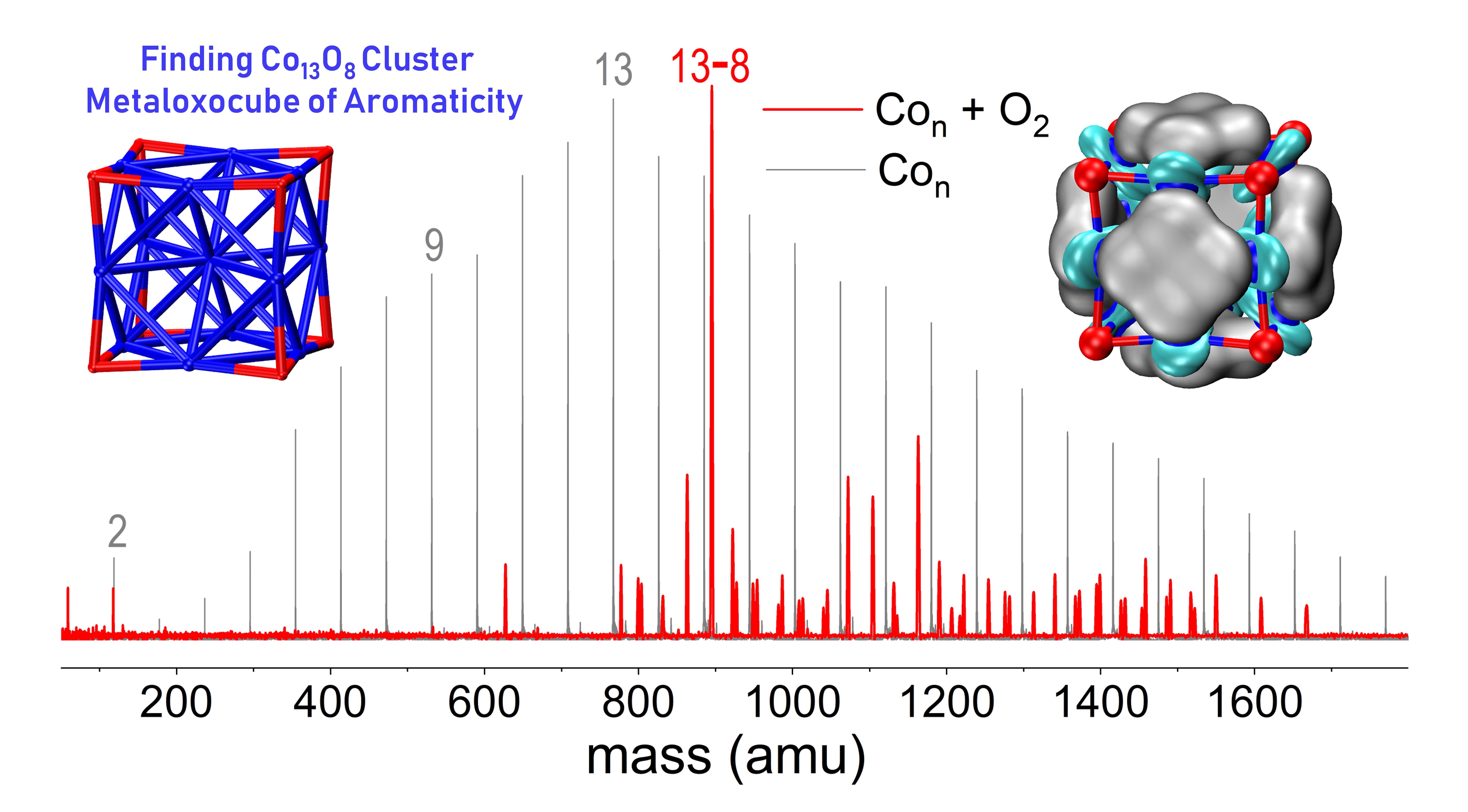 圖2. 中性Con純金屬團簇質(zhì)譜分布及其與大量氧氣反應(yīng)后的質(zhì)譜;插圖為Co13O8氧立方結(jié)構(gòu)及其芳香性描述