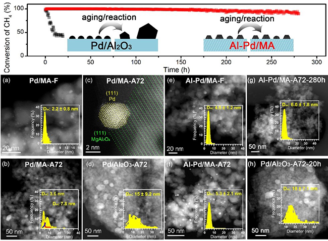 甲烷催化燃燒因在潔凈能源轉(zhuǎn)化與利用及環(huán)境保護方面的重要應(yīng)用而受到廣泛關(guān)注。負(fù)載Pd催化劑在該反應(yīng)中具有優(yōu)異的催化活性,但該催化劑實際使用過程中經(jīng)常面臨高濕反應(yīng)氣體以及高溫反應(yīng)條件,導(dǎo)致Pd納米顆粒燒結(jié)長大,降低催化劑性能。因此開發(fā)具有高活性、高水熱穩(wěn)定性的甲烷催化燃燒材料極具挑戰(zhàn)。該團隊長期致力于高熱穩(wěn)定貴金屬納米顆粒催化劑的制備,在前期研究中發(fā)現(xiàn)Pt和Au納米顆粒與界面匹配的尖晶石可以形成外延結(jié)構(gòu),使負(fù)載的Pt和Au納米顆??梢越?jīng)受800-1200°C的高溫而不明顯長大(Nat. Commun., 2013;Nano Lett., 2018)。Pd與Pt具有相近的晶格常數(shù),理論上可以采用相同策略提高負(fù)載Pd催化劑的熱穩(wěn)定性。然而,由于Pd納米顆粒在空氣中極易被氧化,導(dǎo)致金屬—載體界面的失配度增加,從而失去抗燒結(jié)的能力。