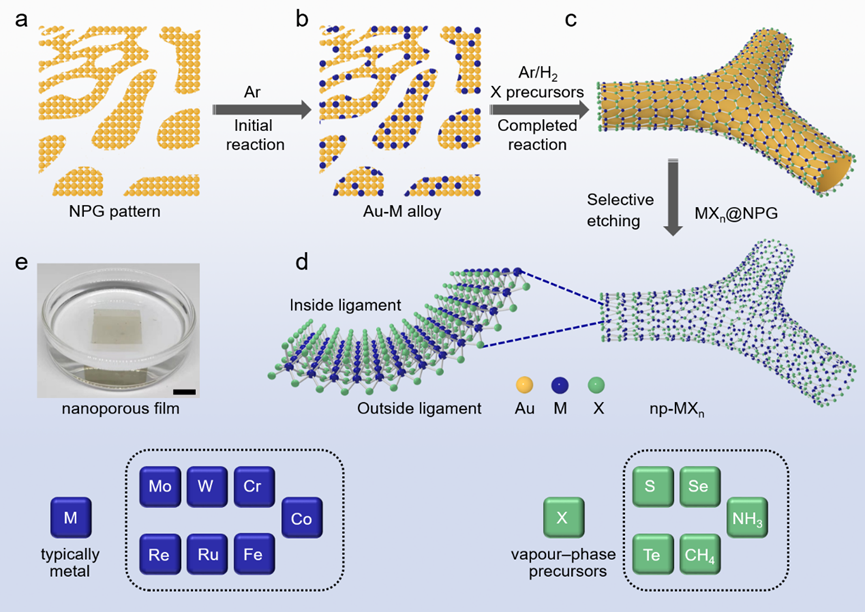 湖南大學材料院譚勇文教授課題組在國際頂尖材料類期刊《Advanced Materials》(IF=27.398)發(fā)表題為“General Synthesis of Nanoporous 2D Metal Compounds with 3D Bicontinous Structure”的研究論文。基于表面合金策略,該工作通過一種納米多孔金輔助化學氣相沉積的通用方法,實現(xiàn)了具有原子厚度、孔徑可調(diào)的19種二元和5種三元納米多孔二維金屬化合物的合成,包括硫化物、硒化物、碲化物、氮化物、碳化物。得益于納米雙連續(xù)多孔結(jié)構(gòu)以及豐富的吸附活性位點,合成的3D MoSSe合金材料展現(xiàn)出優(yōu)異的電催化氮還原性能。這項工作為制造具有三維雙連續(xù)多孔結(jié)構(gòu)的二維金屬化合物提供了一個通用的框架,極大地豐富了納米多孔材料的種類。