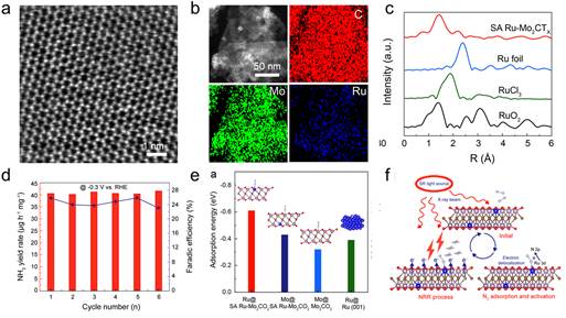 針對上述關鍵問題,課題組博士研究生彭偉采用一種缺陷自發(fā)還原的方法,成功制備了Ru單原子摻雜的Mo2CTX MXene 納米片NRR催化劑,該催化劑在常溫常壓下展示出較高的NRR選擇性和NH3產(chǎn)率。在該工作中,引入Ru單原子不僅極大豐富了Mo2CTX MXene的反應活性位點,還增強了催化劑的本征活性。此外,利用原位同步輻射表征和理論模擬手段對復合催化劑在實際催化條件下進行了系統(tǒng)研究,發(fā)現(xiàn)Ru原子摻入Mo2CTX納米片中,調(diào)節(jié)了Mo2CTX的電子結(jié)構(gòu),不僅加快了N2分子吸附和活化,還降低了NRR限速步驟的熱力學能壘。這項工作不僅合成了高性能MXene基NRR催化劑并系統(tǒng)研究了其催化活性來源,而且為實現(xiàn)高效環(huán)保的能源轉(zhuǎn)換系統(tǒng)開辟了道路。相關研究成果 “Spontaneous Atomic Ruthenium Doping in Mo2CTX MXene Defects Enhances Electrocatalytic Activity for the Nitrogen Reduction Reaction” 發(fā)表在國際權(quán)威材料領域期刊《Advanced Energy Materials》(IF=25.245)上。