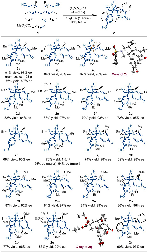 研究人員發(fā)現(xiàn),在優(yōu)化條件下各類含富電子取代基的雙苯酚衍生物均以優(yōu)秀的立體選擇性得到含多個手性中心的環(huán)己二烯酮化合物,且所有反應(yīng)均在30分鐘內(nèi)結(jié)束。反應(yīng)能擴(kuò)大至克級規(guī)模,收率和立體選擇性不受影響。