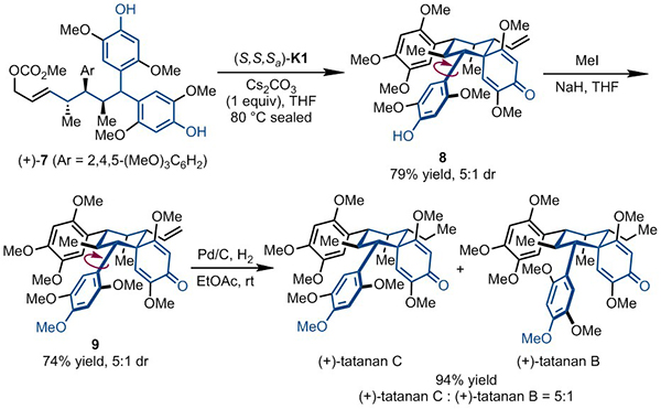 該方法可應(yīng)用于天然產(chǎn)物tatanan B和tatanan C的合成。雙苯酚前體(+)-7可在手性銥絡(luò)合物(S,S,Sa)-K1的作用下發(fā)生不對稱烯丙基去芳構(gòu)化反應(yīng)以79%的收率得到一對阻旋異構(gòu)體8,后者再經(jīng)過兩步反應(yīng)即可得到天然產(chǎn)物tatanan C和tatanan B的混合物(5:1),且無其他非對映異構(gòu)體生成。該結(jié)果優(yōu)于文獻(xiàn)已知報道。
