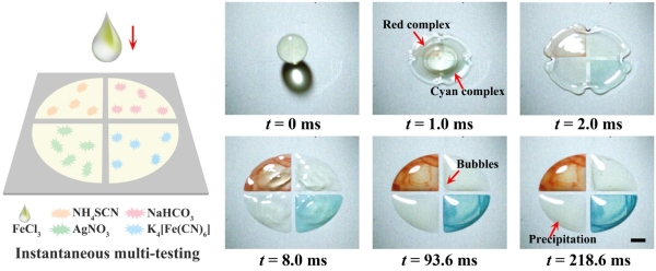 液滴碰撞到圖案化浸潤(rùn)性基底表面后,在慣性力的作用下首先鋪展形成圓形的液膜。隨后,液膜在親水區(qū)域發(fā)生粘附,在疏水區(qū)域回縮,最終自發(fā)切割形成數(shù)目及形貌均精確可控的微液滴陣列,并在特定位置發(fā)生沉積。一方面,液滴自切割過(guò)程中,不同微液滴之間不存在物質(zhì)交換;另一方面,疏水區(qū)域能夠?qū)⑽⒁旱蜗抻虺上嗷オ?dú)立的反應(yīng)微區(qū)。在此基礎(chǔ)上,通過(guò)在圖案化浸潤(rùn)性基底表面預(yù)沉積不同的檢測(cè)試劑,對(duì)單個(gè)液滴自切割形成的微液滴陣列分別進(jìn)行檢測(cè),實(shí)現(xiàn)了液滴中復(fù)雜成分的分析和鑒定,為新型生物檢測(cè)芯片的設(shè)計(jì)和高效檢測(cè)方法的研發(fā)提供了新思路。