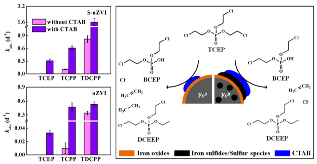 目前,一些高級(jí)氧化技術(shù)(如UV/H2O2、UV/TiO2、UV/過硫酸鹽等)已被證實(shí)可以有效地降解水體環(huán)境中的Cl-OPEs,但關(guān)于Cl-OPEs還原降解技術(shù)的研究甚少。納米零價(jià)鐵是一種高效的脫鹵還原劑,能將多種疏水性鹵代有機(jī)污染物(HOCs)還原降解為低鹵代或無鹵代化合物,被廣泛應(yīng)用于污廢水、地表水、地下水等污染環(huán)境的修復(fù)。然而,關(guān)于納米零價(jià)鐵是否具有還原降解高水溶性HOCs(尤其是Cl-OPEs)的能力還不清楚。十六烷基三甲基溴化銨(CTAB)是一種廣泛分布于水體環(huán)境中的陽離子表面活性劑,其兩性分子基團(tuán)可以改變HOCs在固-液界面的吸附/解吸行為,進(jìn)而影響納米零價(jià)鐵對(duì)HOCs的降解。Cl-OPEs具有兩種獨(dú)特的官能團(tuán)(親水性磷酸酯基團(tuán)和疏水性氯代烷基基團(tuán)),CTAB對(duì)Cl-OPEs的固-液界面吸附/解吸行為的影響可能與疏水性HOCs不同,值得深入研究。