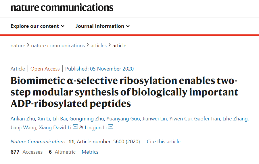 [2] Zhu, A., Li, X., Bai, L. et al. Biomimetic α-selective ribosylation enables two-step modular synthesis of biologically important ADP-ribosylated peptides. Nat Commun 11, 5600 (2020). https://doi.org/10.1038/s41467-020-19409-1