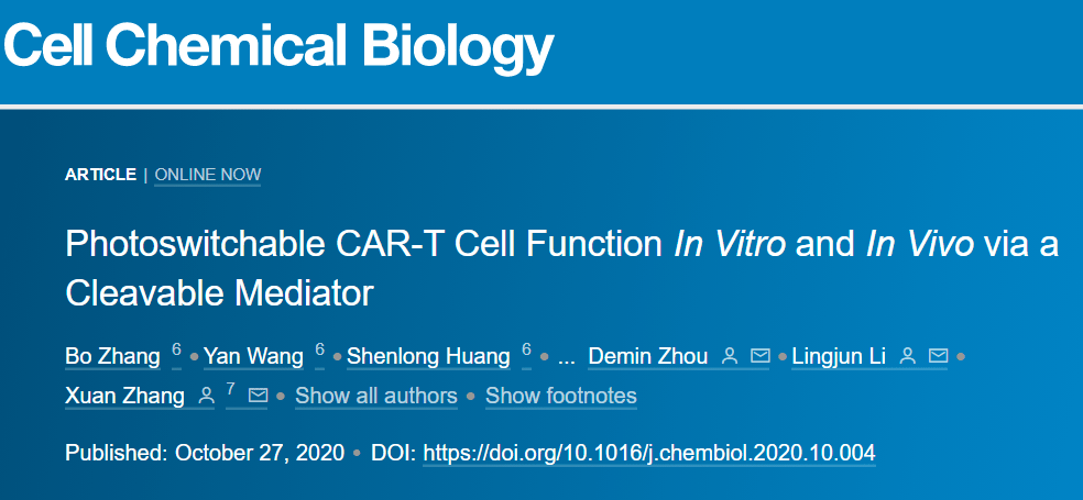 [3] Cell Chemical Biology,Photoswitchable CAR-T Cell Function In Vitro and In Vivo via a Cleavable Mediator,https://doi.org/10.1016/j.chembiol.2020.10.004