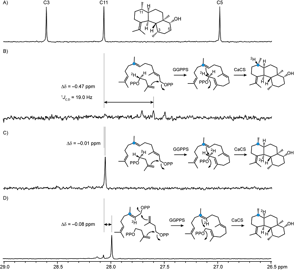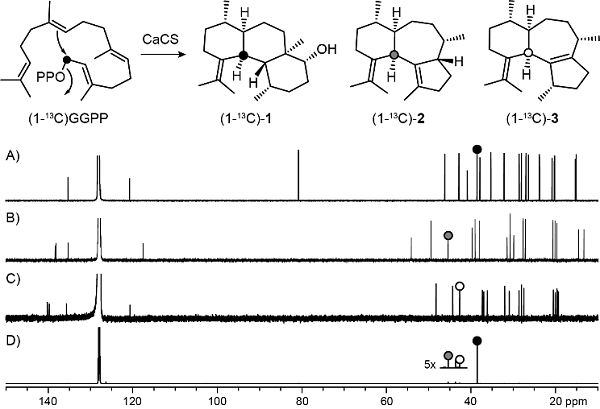 圖3:13C-NMR 譜圖, A) 1, B) 2, C) 3, and D) (1-13C)GGPP 與CaCS孵育的同位素標(biāo)記實(shí)驗(yàn)結(jié)果。圓圈代表13C標(biāo)記。