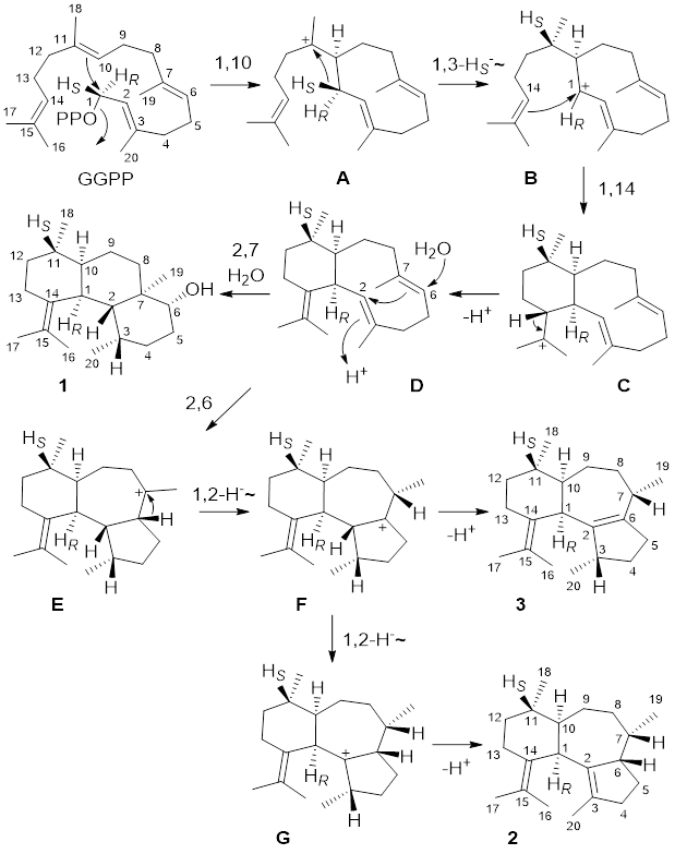 圖2:在二萜合成酶(CaCS)的作用下,GGPP形成新型二萜分子1–3的環(huán)化過(guò)程。