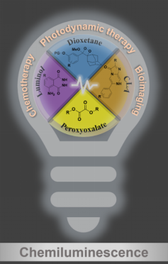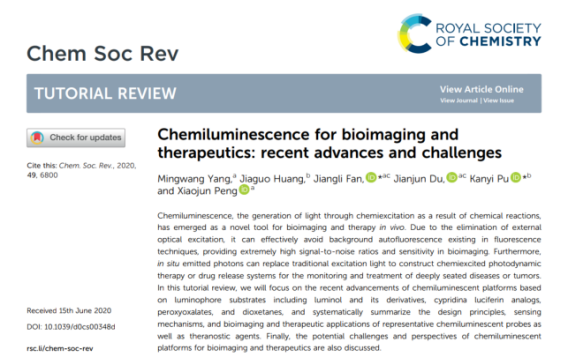 綜述系統(tǒng)介紹了化學發(fā)光在生物成像和治療領域中的最新研究進展。作者在文中重點介紹了基于化學發(fā)光體底物的化學發(fā)光平臺,主要包括魯米諾及其衍生物、海螢螢光素類似物、過氧草酸酯和二氧雜環(huán)丁烷;并系統(tǒng)地總結(jié)了每一類平臺的設計原則、傳感機制和一些代表性的化學發(fā)光探針在生物成像和治療領域中的應用。在本篇綜述的最后,作者分析討論了化學發(fā)光在生物成像和治療方面所面臨的挑戰(zhàn)和發(fā)展前景。