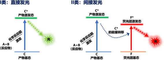 化學發(fā)光主要由化學激發(fā)過程和發(fā)光過程兩部分組成。根據(jù)能量作用過程,化學發(fā)光主要分為直接發(fā)光和間接發(fā)光兩類。直接發(fā)光:反應物A和B發(fā)生化學反應,釋放出的化學能產(chǎn)生部分處于激發(fā)態(tài)的C*和其它物質(zhì)D,激發(fā)態(tài)C*弛豫返回其基態(tài)C時直接發(fā)出可檢測的光信號。間接發(fā)光:反應物A和B同樣發(fā)生化學反應產(chǎn)生激發(fā)態(tài)中間體C*,C*通過能量共振轉(zhuǎn)移的方式將其能量轉(zhuǎn)移給體系中存在的熒光團F,熒光團F吸收能量后由基態(tài)躍遷至激發(fā)態(tài)F*,F*以光輻射的方式返回基態(tài)F。通常該類化學發(fā)光的波長與熒光團F的熒光發(fā)射波長相一致。
