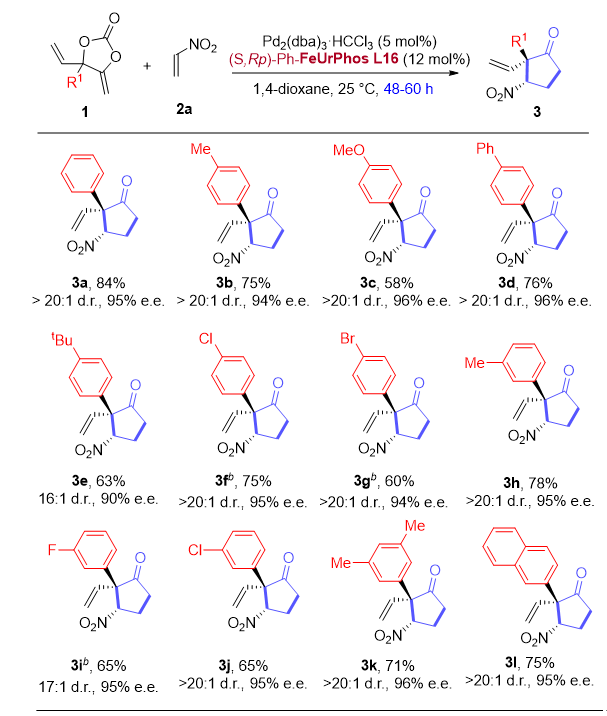 最終,他們發(fā)現(xiàn)苯甘氨醇衍生的(S,Sp)-Ph-FeUrPhos這一優(yōu)勢配體,首次實(shí)現(xiàn)了氧烯丙基鈀正離子與缺電子烯烴不對稱(3+2)反應(yīng),以中等收率(up to 89% yield)和優(yōu)異的立體選擇性(up to 99% ee, >20:1 dr),構(gòu)建了一系列含連續(xù)手性中心環(huán)戊酮化合物(圖4)。