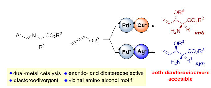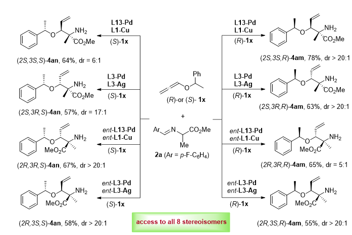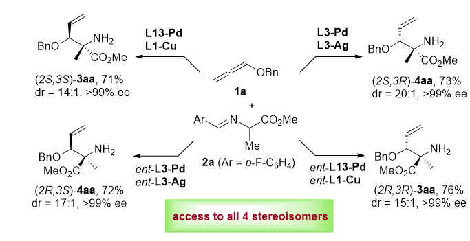 資偉偉課題組長期致力于PdH相關(guān)的不對稱偶聯(lián)反應(yīng)的研究,近期他們通過PdH與Cu催化以及PdH與Ag催化的相結(jié)合的雙金屬協(xié)同催化模式,實(shí)現(xiàn)了烷氧基聯(lián)烯和醛亞胺酯的立體發(fā)散合成偶聯(lián)反應(yīng)。該體系可以用來高度立體選擇性合成包含鄰二手性中心的syn-或者anti-β-氨基醇(圖1)。更進(jìn)一步,通過雙金屬體系及手性配體的合理搭配,同一個(gè)β-氨基醇的四個(gè)異構(gòu)體(R,R),(R,S),(S,R) (S,S)都可以以非常高的對映選擇性、非對映選擇性獲得(圖2)。