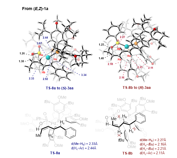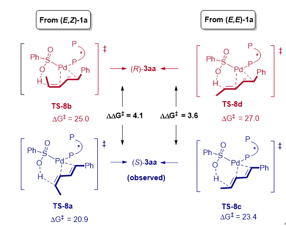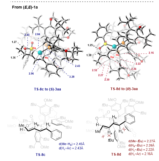 結(jié)合實(shí)驗(yàn)和DTF計(jì)算研究表明,該反應(yīng)并沒有涉及到PdH物種參與的轉(zhuǎn)化。而是通過配體到配體的氫轉(zhuǎn)移(LLHT)引發(fā),隨后經(jīng)歷六元過渡態(tài)的C-S鍵還原消除來實(shí)現(xiàn)。計(jì)算中發(fā)現(xiàn)LLHT是該反應(yīng)對映選擇性的控制步驟,無論是 (Z,E)-還是 (E,E)-構(gòu)型的1,3-二烯在LLHT步驟中形成目標(biāo)產(chǎn)物(S)-3aa過渡態(tài)能量均低于形成(R)-3aa產(chǎn)物的過渡態(tài)能量。同時(shí)作者進(jìn)一步分析過渡態(tài)的結(jié)構(gòu)發(fā)現(xiàn),底物的烯烴C-H與(R)-DTBM-Segphos的叔丁基之間的立體排斥是手性控制的關(guān)鍵因素(圖3)。