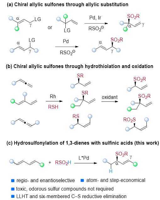 手性砜存在于許多藥物和某些具有生物活性的天然產(chǎn)物中。由于砜基與羰基具有電子等排性,同時(shí)砜基團(tuán)可以與生物靶標(biāo)形成強(qiáng)氫鍵的能力使其用于提高藥效和功效,因此手性砜已廣泛用于現(xiàn)代藥物化學(xué)中。目前烯手性烯丙基砜的合成主要通過鈀、銥催化的烯丙基取代反應(yīng)制備,或者通過聯(lián)烯、1,3-二烯與硫醇化合物的氫硫醚化及后續(xù)氧化來合成。如何通過原子、步驟經(jīng)濟(jì)性的偶聯(lián)反應(yīng),同時(shí)避免使用有毒及惡臭的低價(jià)硫試劑來制備手性烯丙基砜化合物仍舊是一個(gè)挑戰(zhàn)(圖1)。
