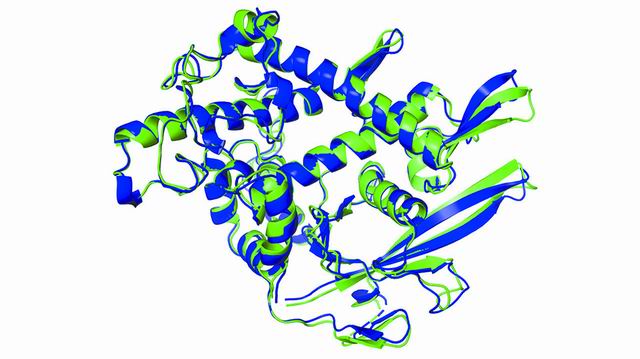 圖中藍(lán)色為計算機(jī)預(yù)測的蛋白質(zhì)結(jié)構(gòu),綠色為實驗驗證結(jié)果,二者相似度非常高。