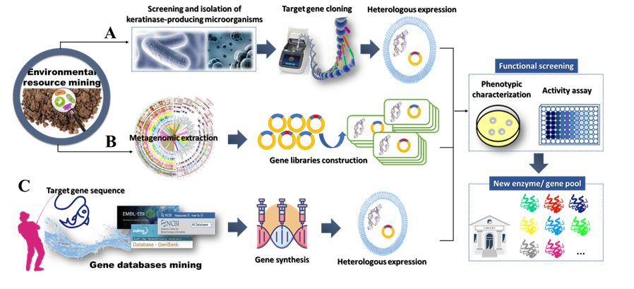 角蛋白酶是一種特殊的蛋白水解酶,能特異性降解結(jié)構(gòu)高度頑固且不溶的角蛋白質(zhì),如羊毛、羽毛、人發(fā)等。作為養(yǎng)殖業(yè)和畜牧業(yè)的主要副產(chǎn)物,全世界每年產(chǎn)生大量的角蛋白廢棄物,由于結(jié)構(gòu)緊湊、二硫鍵含量高而難以處理,通常被焚燒、填埋或直接廢置堆放,不僅給環(huán)境帶來嚴(yán)重污染,也是對(duì)角蛋白資源的極大浪費(fèi)。角蛋白酶的發(fā)現(xiàn)和利用有效地解決了這個(gè)問題,此外,角蛋白酶在飼料、肥料、制革、洗滌劑、化妝品以及醫(yī)藥領(lǐng)域也展現(xiàn)出廣泛的應(yīng)用潛力和價(jià)值。然而,“產(chǎn)量低、活性差、性質(zhì)弱”一直是角蛋白酶研究的瓶頸問題,嚴(yán)重阻礙了角蛋白酶的工業(yè)化生產(chǎn)及應(yīng)用。分子生物技術(shù)的快速發(fā)展為角蛋白酶的生產(chǎn)和性能提升提供了強(qiáng)有力的工具。該綜述系統(tǒng)總結(jié)了角蛋白酶的應(yīng)用潛力,并探討了角蛋白酶催化機(jī)制;對(duì)其分子層面的研究進(jìn)行了全面闡述,包括對(duì)基因序列和蛋白質(zhì)結(jié)構(gòu)的分析;此外,對(duì)角蛋白酶蛋白質(zhì)工程改造的研究進(jìn)展進(jìn)行了綜述和討論,揭示了信號(hào)肽和前導(dǎo)肽等蛋白結(jié)構(gòu)域的改造工程已成為提高角蛋白酶產(chǎn)量的重要策略,先進(jìn)的蛋白質(zhì)工程技術(shù)將推動(dòng)角蛋白酶的工業(yè)化生產(chǎn)并促進(jìn)其在多個(gè)領(lǐng)域的商品化應(yīng)用。