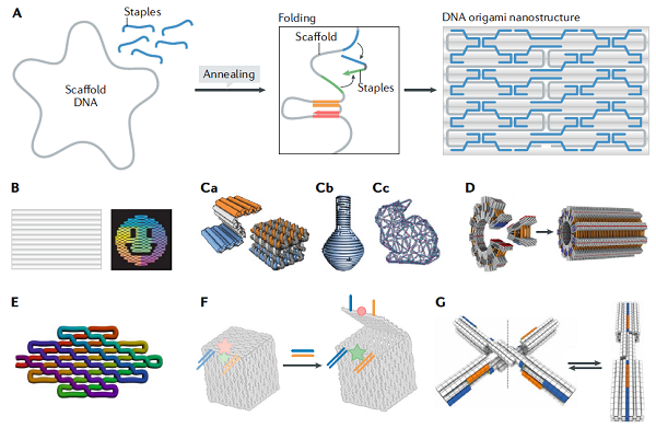 DNA折紙術(shù)(DNA origami)是DNA納米技術(shù)的一個(gè)重要分支。該方法發(fā)明于2006年(Nature 2006),即利用上百條短單鏈DNA作為“訂書釘”,輔助折疊一條長達(dá)數(shù)千堿基的噬菌體基因組單鏈DNA,并自組裝形成預(yù)先設(shè)計(jì)的結(jié)構(gòu)。近年來,DNA折紙術(shù)迎來了快速發(fā)展,目前幾乎可以定制任意形狀的復(fù)雜幾何結(jié)構(gòu),包括各種實(shí)心或者鏤空的3D結(jié)構(gòu)、復(fù)雜曲面結(jié)構(gòu)、可以動(dòng)態(tài)變構(gòu)的納米裝置與納米機(jī)器人等等。多種界面友好的DNA折紙?jiān)O(shè)計(jì)軟件也先后出現(xiàn),大大降低了DNA折紙術(shù)的門檻,使初學(xué)者也可以方便地設(shè)計(jì)定制的折紙結(jié)構(gòu),從而推動(dòng)了整個(gè)領(lǐng)域的繁榮發(fā)展。