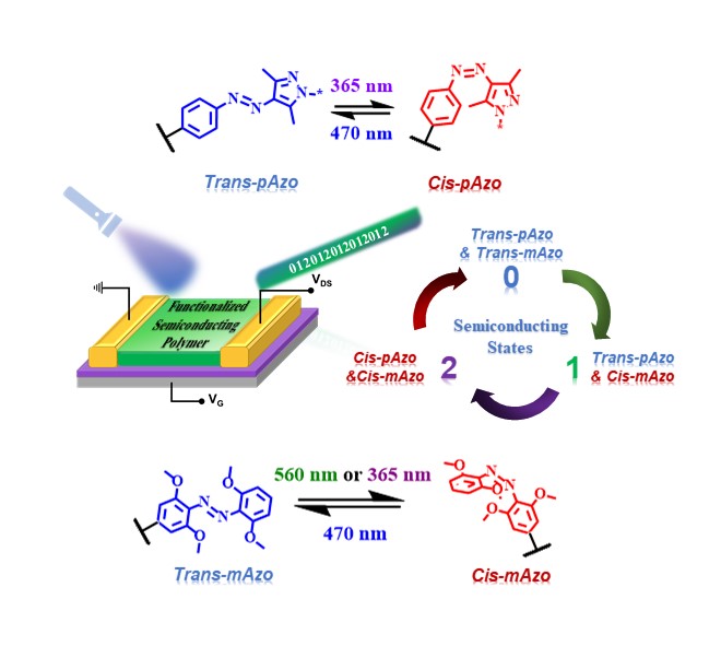 他們進(jìn)一步在有機(jī)高分子半導(dǎo)體側(cè)鏈中引入了兩種不同結(jié)構(gòu)的偶氮苯基團(tuán),即吡唑偶氮苯(pAzo)和tetra-ortho-methoxy-substituted azobenzene (mAzo),設(shè)計(jì)合成了有機(jī)高分子半導(dǎo)體POMPYA,成功實(shí)現(xiàn)了通過560 nm、365 nm、470 nm三種波長(zhǎng)光照對(duì)基于POMPYA薄膜的場(chǎng)效應(yīng)晶體管器件性能的可逆調(diào)控,并可依次達(dá)到三重穩(wěn)定的電導(dǎo)態(tài)。其原理如下:mAzo的可逆順反異構(gòu)化可以通過560nm、365 nm、470 nm的光照進(jìn)行;pAzo的反式到順式的轉(zhuǎn)化可以通過365 nm光照進(jìn)行,而560 nm光照不能驅(qū)動(dòng)順反異構(gòu)化反應(yīng)。因此,兩種偶氮苯基團(tuán)(mAzo和pAzo)的反式到順式異構(gòu)化可以通過560 nm和365 nm的光照依次引發(fā)。GIWAXS數(shù)據(jù)分析表明mAzo及pAzo的順反異構(gòu)可以調(diào)節(jié)POMPYA薄膜的結(jié)晶性。最終,基于POMPYA薄膜的場(chǎng)效應(yīng)器件的性能可通過560 nm、365 nm和470 nm光照下的mAzo及pAzo依次順反異構(gòu)化來進(jìn)行可逆調(diào)控,從而依次達(dá)到三重穩(wěn)定的導(dǎo)電狀態(tài),而且三種狀態(tài)間可以通過特定波長(zhǎng)的光照進(jìn)行可逆轉(zhuǎn)換。通過使用560 nm、365 nm 和470 nm光照作為輸入信號(hào),器件電流IDS作為輸出信號(hào),器件電流IDS隨光照的變化可以模擬三值邏輯門的功能,為構(gòu)建光調(diào)控的多重穩(wěn)態(tài)有機(jī)場(chǎng)效應(yīng)晶體管提供了新的思路 (Adv. Mater. 2021, DOI: 10.1002/adma.202005613)。