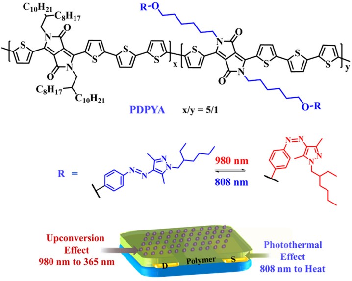 在國(guó)家自然科學(xué)基金委和中國(guó)科學(xué)院的支持下,中科院化學(xué)所有機(jī)固體實(shí)驗(yàn)室張德清課題組首次將偶氮苯基團(tuán)引入有機(jī)高分子半導(dǎo)體的側(cè)鏈,發(fā)現(xiàn)可以通過紫外、可見光照可逆調(diào)控半導(dǎo)體薄膜的結(jié)晶性,進(jìn)而可逆調(diào)控其半導(dǎo)體性能,并表現(xiàn)出光響應(yīng)速度快和器件穩(wěn)定性好的優(yōu)點(diǎn)(Adv. Funct. Mater. 2019, 29, 1807176.)。在此基礎(chǔ)上,他們進(jìn)一步設(shè)計(jì)合成了側(cè)鏈含有吡唑偶氮苯單元(pAzo)的共軛給受體聚合物 PDPYA,協(xié)同使用納米粒子 NaYF4:Yb,Tm 的上轉(zhuǎn)換效應(yīng)和共軛骨架的光熱效應(yīng),成功構(gòu)建了近紅外光(980/808 nm)可逆調(diào)控的有機(jī)場(chǎng)效應(yīng)晶體管,并表現(xiàn)出更優(yōu)異的光穩(wěn)定性,器件電流在經(jīng)過100次循環(huán)光照后,無明顯衰減。除此之外,由于順式構(gòu)型的吡唑偶氮苯具有較高穩(wěn)定性,該器件在 980 nm 光照射后,器件性能可以在暗處穩(wěn)定保持長(zhǎng)達(dá)120天。這些優(yōu)點(diǎn)使得該體系在記憶器件等方面具有潛在的應(yīng)用價(jià)值(Angew. Chem. Int. Ed. 2020, 59, 13844-13851.)。