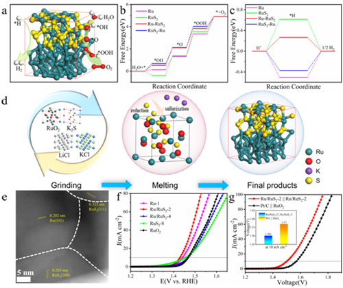 對此,木士春教授團隊對Ru基異質(zhì)介面的電子結(jié)構(gòu)、活性起源及酸性析氫、析氧及全水解電催化性能進行了深入探究。首先,通過密度泛函理論(DFT)理論計算發(fā)現(xiàn)釕/二硫化釕(Ru/RuS2)異質(zhì)介面具有較高的電子態(tài),且其界面上存在明顯的電荷轉(zhuǎn)移趨勢,使得表面Ru原子對催化中間體的吸附能得到優(yōu)化,從而降低了反應(yīng)能壘,提高了本征活性。繼而,利用熔鹽體系下硫化鉀的同步還原與硫化作用,獲得了新穎的Ru/RuS2異質(zhì)介面結(jié)構(gòu)催化材料。電化學(xué)測試表明,在酸性介質(zhì)下,Ru/RuS2展示出極低的析氧(201 mV @ 10 mA cm-2)、析氫過電位(45 mV @ 10 mA cm-2)及優(yōu)異的循環(huán)穩(wěn)定性。將其用于質(zhì)子交換膜電解水系統(tǒng)時,僅需1.501 V電壓值就可達到10 mA cm-2的電流密度。該項研究成果將為異質(zhì)界面結(jié)構(gòu)的理性設(shè)計與可控構(gòu)筑提供指導(dǎo)。