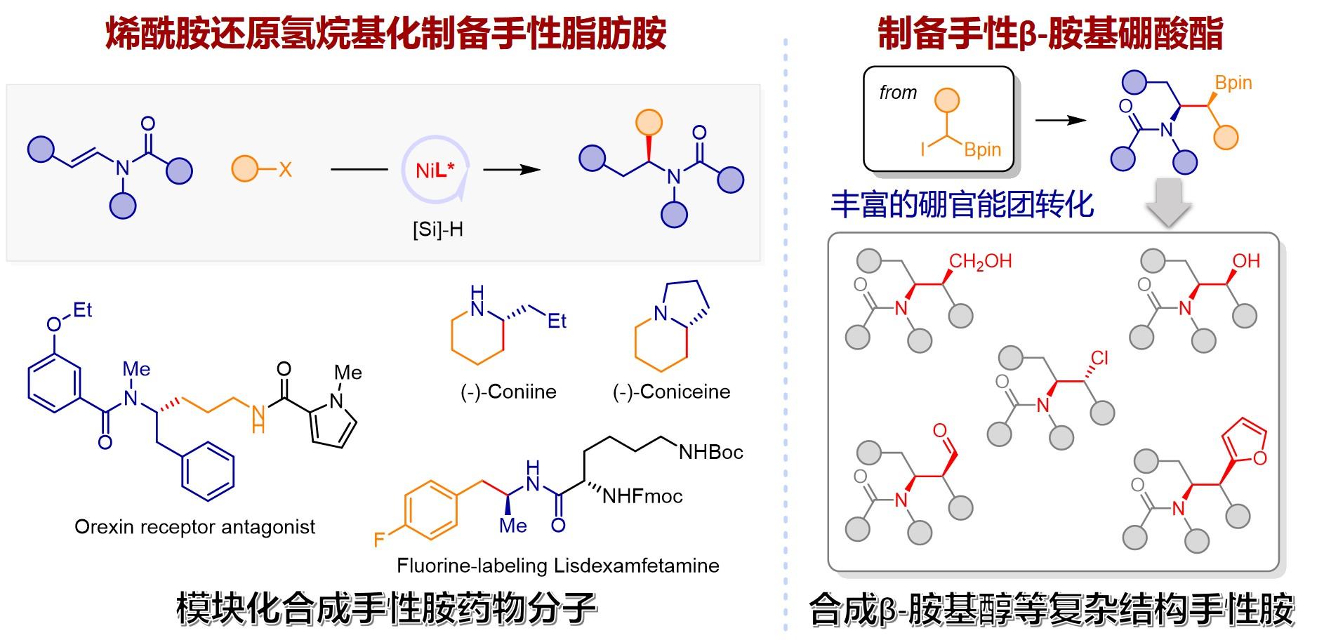 研究團(tuán)隊(duì)提出“烯烴還原偶聯(lián)”概念,開(kāi)發(fā)廉價(jià)金屬鎳催化體系,以烯烴替代當(dāng)量金屬試劑實(shí)現(xiàn)溫和條件碳-碳偶聯(lián),簡(jiǎn)化合成步驟、豐富底物范圍、提升官能團(tuán)兼容性 (Nat. Commun. 2016,7, 11129;J. Am. Chem. Soc. 2017,139, 12632;J. Am. Chem. Soc. 2020,142, 214)。近期,研究團(tuán)隊(duì)在飽和碳偶聯(lián)合成手性胺方向取得重要進(jìn)展,成功實(shí)現(xiàn)鎳氫催化烯酰胺不對(duì)稱(chēng)氫烷基化。反應(yīng)使用性質(zhì)穩(wěn)定、易于獲取的烯酰胺與烷基鹵化物為原料,高對(duì)映選擇性制備?;Wo(hù)的手性脂肪胺化合物,反應(yīng)條件溫和、底物適用范圍廣。反應(yīng)可應(yīng)用于多種天然產(chǎn)物、藥物分子高效合成和修飾。例如,反應(yīng)可以實(shí)現(xiàn)生物堿毒芹堿、多動(dòng)癥藥物利地美、哮喘藥卡莫特羅等生理活性分子或其同位素標(biāo)記物的高效合成。此外,反應(yīng)還可實(shí)現(xiàn)烯酰胺與α-硼酸酯鹵化物的不對(duì)稱(chēng)氫烷基化,制備具有兩個(gè)手性中心的β-胺基硼酸酯。新方法串聯(lián)有機(jī)含硼化合物豐富的轉(zhuǎn)化,如氧化和芳基化等,將有助于開(kāi)發(fā)復(fù)雜結(jié)構(gòu)的胺類(lèi)手性分子。