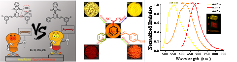 該課題組設(shè)計并合成了結(jié)構(gòu)對稱和非對稱的以茚-1,3-二酮亞甲基為受體單元的D-π-A型聚集誘導(dǎo)發(fā)光(AIE)分子4H-吡喃類衍生物 (Scheme 1),發(fā)現(xiàn)在研磨條件下,連有甲基和三氟甲基的非對稱目標(biāo)化合物顯示出可逆的MFC活性,其形貌分別表現(xiàn)出從一種晶態(tài)到另一晶態(tài)和非晶態(tài)的轉(zhuǎn)變;而具有對稱性的相應(yīng)化合物由于其緊密的堆積模式,晶態(tài)結(jié)構(gòu)在研磨下不容易被破壞,沒有表現(xiàn)出明顯的固態(tài)發(fā)射顏色變化,即甲基和三氟甲基的引入對目標(biāo)化合物刺激響應(yīng)行為的影響受分子的對稱性控制,表明通過改變特定熒光分子結(jié)構(gòu)的對稱性有可能獲得高對比度的MFC熒光材料(Dyes Pigm. 2019, 162, 203-213)。進(jìn)一步合成了一種含有二氰基亞甲基、苯和4-羥基苯的具有AIE性質(zhì)的4H-吡喃衍生物AMP (Scheme 2),發(fā)現(xiàn)這種非對稱的化合物表現(xiàn)出多晶態(tài)的性質(zhì)。黃色發(fā)光的AMP-y和紅色發(fā)光的APM-r具有非常相似的扭曲構(gòu)象,它們不同的固態(tài)熒光發(fā)射不僅取決于分子構(gòu)象,還取決于同時含有J-聚集和H-聚集的zigzag堆積方式之間的微小差異,而橙色發(fā)光的AMP-o的固態(tài)發(fā)射則主要源于完全平面的分子構(gòu)象。在研磨條件下,這些多晶體的固態(tài)發(fā)光顯示出不同的刺激響應(yīng)行為:AMP-y和APM-r分別顯示出紅移和藍(lán)移的MFC性質(zhì),AMP-o的熒光顏色則沒有呈現(xiàn)出明顯的變化,表明多晶性與MFC性質(zhì)的結(jié)合有利于豐富MFC材料的熒光顏色變化(J. Phys. Chem. C 2019, 123, 27742?27751)。