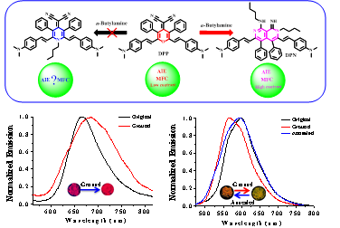 對一個特定母體結(jié)構(gòu)的熒光分子而言,由于分子構(gòu)象扭曲程度的增加有利于賦予其AIE和MFC性質(zhì),課題組基于一個簡單的4H-吡喃類衍生物合成了具有高度扭曲構(gòu)象的3,5-二苯基-4H-吡喃類衍生物DPP和4,5-二苯基-2,7-萘啶類化合物DPN (Scheme 11)。對化合物DPP而言,盡管在4H-吡喃骨架上3位和5位具有較大空間位阻的苯基的引入實現(xiàn)了從聚集誘導(dǎo)熒光淬滅(ACQ)熒光分子到AIE熒光分子的轉(zhuǎn)變,但其只顯示了一個低對比度的MFC活性。而具有高度扭曲分子構(gòu)象的AIE分子DPN是化合物DPP與正丁胺通過一個開環(huán)以及隨后的多次分子內(nèi)關(guān)環(huán)機(jī)制意外合成得到的,其在研磨條件下,表現(xiàn)出高對比度的可逆MFC性質(zhì)。這一研究結(jié)果為從ACQ母體熒光分子構(gòu)建結(jié)構(gòu)新穎、具有AIE和MFC活性的熒光分子的開發(fā)提供了可借鑒的新思路(Chem Asian J. 2020, 15, 3437-3443)。