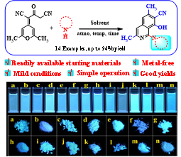 課題組通過一個簡單易得的4H-吡喃衍生物與各種仲胺的反應(yīng)實現(xiàn)了一系列結(jié)構(gòu)新穎、具有扭曲構(gòu)象的3,6-二甲基-7-氰基-1-氨基-8-羥基異喹啉類化合物的合成(Scheme 12)。這個反應(yīng)具有無金屬、反應(yīng)條件溫和、操作簡單、產(chǎn)率高等優(yōu)點。這個反應(yīng)被證明經(jīng)歷了一個開環(huán)和連續(xù)閉環(huán)的反應(yīng)機(jī)制。這些1-氨基異喹啉類化合物在溶液中能發(fā)射強(qiáng)烈的藍(lán)色熒光,更重要的是,這些化合物由于具有扭曲的分子構(gòu)象和松散的晶態(tài)堆積排列,可以避免芳環(huán)之間形成強(qiáng)π···π堆積相互作用,發(fā)射出強(qiáng)烈的藍(lán)色固態(tài)熒光,表現(xiàn)出兩相發(fā)光的性質(zhì)(Chem Asian J. 2020, 15, 1692–1700)。由于通過此反應(yīng)獲得的異喹啉衍生物具有多個可發(fā)生反應(yīng)的位點,為新型異喹啉類固體熒光材料的開發(fā)提供多種可能性,如本課題組以此反應(yīng)為基礎(chǔ),通過在異喹啉的8位引入具有強(qiáng)推電子能力的三苯胺和咔唑,構(gòu)建了兩種新型的D-π-A異喹啉衍生物IQ-TPA和IQ-PC (Scheme 13)。研究發(fā)現(xiàn)這兩個化合物表現(xiàn)出多晶態(tài)的性質(zhì),分別具有兩個在固態(tài)發(fā)射不同熒光的多晶體,且它們不同的發(fā)光被證明是源于不同的分子構(gòu)象,即1位上的哌啶基團(tuán)分別處于異喹啉環(huán)的兩側(cè)。對于IQ-TPA而言,黃色熒光的IQ-TPA-y可以轉(zhuǎn)化為綠色熒光的IQ-TPA-g,并通過不同晶態(tài)之間的轉(zhuǎn)化分別表現(xiàn)出MFC和熱致變色性質(zhì)。由于晶態(tài)分子間強(qiáng)的相互作用,IQ-PC沒有表現(xiàn)出MFC活性,但綠色熒光的IQ-PC-g可以通過熱退火的方法轉(zhuǎn)化為黃色熒光的IQ-PC-y,表現(xiàn)出熱致變色的性質(zhì)(J. Mater. Chem. C 2019, 7, 12580-12587)。課題組進(jìn)一步以二氰亞甲基-4H-吡喃衍生物和仲胺為原料,通過一個開環(huán)和連續(xù)關(guān)環(huán)的反應(yīng)機(jī)制合成了一系列結(jié)構(gòu)新型、具有扭曲分子構(gòu)象的3,6-二氨基-4-氰基-7,8-二氫異喹啉類衍生物(Scheme 14)。該反應(yīng)具有原料易得、操作簡單、反應(yīng)條件溫和、底物范圍廣和產(chǎn)率較高的優(yōu)點。其產(chǎn)物由于具有扭曲的分子構(gòu)象和松散的堆積方式能發(fā)射波長覆蓋整個可見光范圍的固態(tài)熒光。它們中的部分化合物在受到外在壓力的刺激下,分別通過分子共軛程度的增強(qiáng)或減弱的方式表現(xiàn)出從藍(lán)色到青色、從橙色到綠色、從紅色到橙色的MFC現(xiàn)象,揭示了固體熒光的全色發(fā)色也可以通過MFC行為來實現(xiàn),這一現(xiàn)象可設(shè)計用于重要圖像或文本信息的加密領(lǐng)域。此項研究工作被選為Front Cover Paper發(fā)表在知名國際刊物Org. Chem. Front.上(Org. Chem. Front. 2021, 8, 856–867)。
