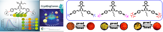 課題組設(shè)計合成了一系列以氰基(乙氧羰基)亞甲基為吸電子單元的D-π-A型1,4-二氫吡啶衍生物CMD-H、CMD-F、CMD-Cl和CMD-Br (Scheme 7),探討了鹵原子的引入對目標(biāo)化合物MFC活性的影響。研究發(fā)現(xiàn)與CMD-H相比,鹵素原子的引入使CMD-F、CMD-Cl和CMD-Br的構(gòu)象更加扭曲,堆積排列更加松散,從而表現(xiàn)出具有更高對比度的MFC活性。這項研究工作發(fā)表在知名國際刊物CrystEngComm上 (CrystEngComm 2019, 21, 4258-4266),且被選為當(dāng)期的封面文章。課題組也設(shè)計并合成了分別連有三甲基硅基(DHP-TMS)、叔丁基二甲基硅基(DHP-TBMS)和三異丙基硅基(TIPS)的D-π-A型的1,4-二氫吡啶類化合物(Scheme 8),發(fā)現(xiàn)DHP-TBMS和DHP-TIPS由于具有更大的空間位阻效應(yīng)而表現(xiàn)出具有更高對比度的MFC活性(Dyes Pigm. 2020, 174, 108094)。