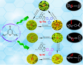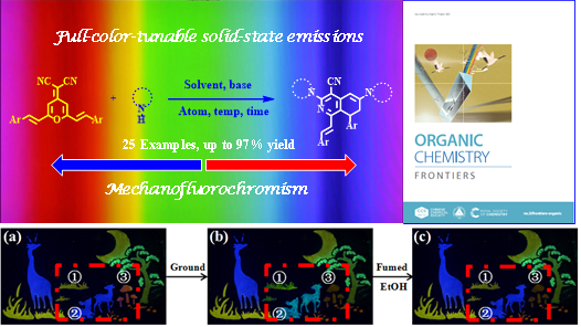 在壓力、酸性氣體、溫度或有機(jī)溶劑氣體等外在刺激下,刺激響應(yīng)型有機(jī)固態(tài)熒光材料能發(fā)生熒光顏色轉(zhuǎn)變,分別表現(xiàn)出壓致變色(MFC)、酸致變色、熱致變色和氣致變色性質(zhì),并且其中一種刺激方式導(dǎo)致的熒光變色往往可以通過另外一種或多種刺激方式恢復(fù),這一特性使其在熒光傳感器、信息存儲、安全油墨、商品防偽和發(fā)光器件等領(lǐng)域有著重要的應(yīng)用前景,近年來受到了研究者的極大關(guān)注。溫州大學(xué)化學(xué)與材料工程學(xué)院吳華悅教授和黃小波教授課題組一直致力于刺激響應(yīng)型有機(jī)固態(tài)熒光材料的合成與性質(zhì)研究,并受邀在國際知名期刊J. Mater. Chem. C上撰寫了相關(guān)領(lǐng)域的綜述評論文章(J. Mater. Chem. C, 2018, 6, 5075)。近年來,該課題組進(jìn)一步從4H-吡喃這一傳統(tǒng)熒光結(jié)構(gòu)單元出發(fā),利用其簡單衍生物通過特定的化學(xué)反應(yīng)生成了多個系列具有新穎結(jié)構(gòu)的4H-吡喃衍生物、吡啶衍生物、異喹啉衍生物和2,7-萘啶類衍生物,探索了目標(biāo)化合物的光物理性質(zhì)及其在固態(tài)熒光/小分子摻雜室溫磷光材料領(lǐng)域的應(yīng)用。