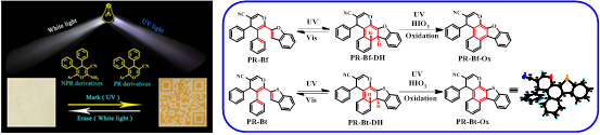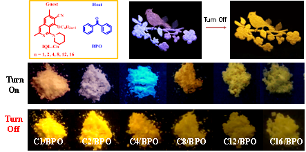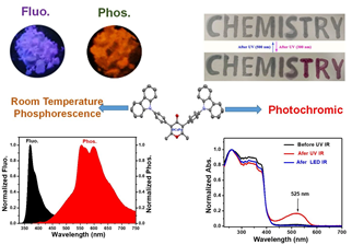 課題組通過在吡喃環(huán)的3/5位上引入一個9-苯基-9H-咔唑基(CzPy)、二個9-苯基-9H-咔唑基(DCzPy)、一個9-苯基-9H-咔唑基和一個溴原子(CzPyBr)合成了三個新的D-A型4H-吡喃酮分子,發(fā)現(xiàn)這些化合物同時具有室溫磷光(RTP)性質(zhì)和光致變色性質(zhì)(Scheme 15)。這些化合物只在結(jié)晶狀態(tài)下發(fā)出強(qiáng)烈的橙黃色室溫磷光,理論計算表明分子間的相互作用是其產(chǎn)生磷光的必要條件。結(jié)晶態(tài)的CzPyBr和無定形態(tài)的DCzPy表現(xiàn)出優(yōu)異的光致變色性質(zhì),具有變色速度快、對比度高、可逆性好、在水、熱、氧環(huán)境中穩(wěn)定性強(qiáng)等優(yōu)點。單晶結(jié)構(gòu)分析表明化合物在不同形態(tài)下的分子間的相互作用可能是導(dǎo)致光致變色性質(zhì)的主要因素。此外,以二苯甲酮(BPO)為主體分子,DCzPy為客體分子,所得的DCzPy/BPO摻雜材料具有優(yōu)異的光致變色性質(zhì)和良好的可逆性,可用于貴重物品的信息加密和防偽,并且由于制備方法簡單、主體分子廉價和性能優(yōu)良的特點,所以非常適合大規(guī)模商業(yè)化制備和推廣(J. Mater. Chem. C, 2020, 8, 17410-17416)。
