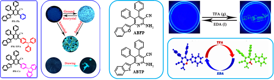 課題組通過在吡喃環(huán)的6位上引入苯并呋喃(NPR-Bf和PR-Bf)和苯并噻吩(NPR-Bt和PR-Bt),設(shè)計合成了多種4,5,6-三芳基-4H-吡喃衍生物(Scheme 3),研究發(fā)現(xiàn)這些化合物的固態(tài)樣品在紫外光-白光的照射下,外觀顏色呈現(xiàn)出對比度高、響應(yīng)時間短和耐疲勞性好的可逆光致變色現(xiàn)象。通過實驗結(jié)合和理論分析,可以證實這些化合物的可逆固態(tài)光致變色活性由分子內(nèi)的開環(huán)-關(guān)環(huán)反應(yīng)導(dǎo)致(Scheme 4)。由于光致變色和漂白過程之間具有良好的可逆性,這些光致變色化合物也可以發(fā)展成可重寫的光記錄介質(zhì)(Mater. Chem. Front. 2021, DOI: 10.1039/D1QM00152C)。進(jìn)一步從2-氨基4,5,6-三芳基-4H-吡喃衍生物出發(fā),通過在吡喃環(huán)的6位上引入苯(PR-Ph)、三苯胺(PR-TPA)和9-苯基-9H-咔唑(PR-Cz),合成了三種結(jié)構(gòu)新穎、具有扭曲分子構(gòu)象的2,3,4,6-四芳基-4H-吡喃衍生物(Scheme 5),發(fā)現(xiàn)PR-Ph和PR-Cz由于結(jié)晶能力較弱,研磨前后沒有發(fā)生形貌的變化,固態(tài)熒光顏色不變,而PR-TPA則由于具有較強(qiáng)的結(jié)晶能力,在研磨后實現(xiàn)了由晶態(tài)到無定形態(tài)的轉(zhuǎn)變,表現(xiàn)出罕見的熒光增強(qiáng)和紅移的MFC性質(zhì),這一結(jié)果表明可以通過簡單地在分子的母體結(jié)構(gòu)中引入不同的芳香基團(tuán)來調(diào)節(jié)熒光分子的結(jié)晶能力,從而導(dǎo)致MFC活性(CrystEngComm, 2020, 22, 6529-6535)。從2-氨基4,5,6-三芳基-4H-吡喃衍生物出發(fā),課題組在吡啶環(huán)的6位上引入苯并呋喃(ABFP)和苯并噻吩(ABTP),合成了具有固態(tài)酸致變色性質(zhì)、可被開發(fā)為文本或圖像信息可重寫光學(xué)介質(zhì)的4,5,6-三芳基取代吡啶衍生物(Scheme 6)。通過X射線單晶衍射分析,目標(biāo)化合物的可逆固態(tài)酸致變色活性被證實源于分子結(jié)構(gòu)中吡啶環(huán)上氮原子的質(zhì)子化-脫質(zhì)子化作用(Dyes Pigm. 2021, 188, 109217)。