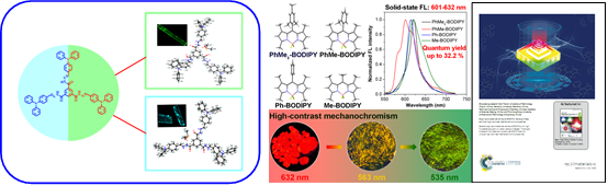 課題組也設(shè)計并合成了一種具有扭曲構(gòu)象的星形三苯胺-苯-1,3,5-三碳酰肼分子(TBTCH, Scheme 19),研究發(fā)現(xiàn)目標(biāo)分子表現(xiàn)出有趣的多功能光學(xué)性質(zhì):溶致變色性質(zhì)、AIE性質(zhì)、成膠性能、多晶態(tài)以及MFC性質(zhì)。特別是,即使存在多個柔性酰肼基,TBTCH也能表現(xiàn)出多晶體的性質(zhì),TBTCH-g和TBTCH-c由于具有不同的分子構(gòu)象和非共價相互作用而分別發(fā)射綠色和青色的固態(tài)熒光,并在研磨的處理下顯示出高對比度、波長紅移的MFC性質(zhì)(Chem. Commun. 2020, 56, 13638-13641)。課題組與廣西大學(xué)曾林濤教授、山東大學(xué)牛廣樂教授合作,設(shè)計并合成了四個meso位取代的BODIPY衍生物 (Scheme 20),研究發(fā)現(xiàn)這些BODIPY化合物在四氫呋喃溶液中發(fā)射綠色的熒光(512-520 nm),在晶態(tài)條件下則發(fā)射出紅色熒光(601-632 nm),表現(xiàn)出兩相發(fā)光的性質(zhì),且其在結(jié)晶狀態(tài)下的熒光光譜的紅移被證明是由J-聚集的形成導(dǎo)致的。這些化合物在溶液態(tài)和結(jié)晶態(tài)的熒光量子產(chǎn)率最高可以分別達(dá)到85%和32.2%。更為重要的是,PhMe3-BODIPY、PhMe-BODIPY和Ph-BODIPY的單晶在輕輕研磨的條件下,會發(fā)生從單晶到微晶的轉(zhuǎn)變,表現(xiàn)從紅色到黃色的顯著熒光顏色變化。進(jìn)一步,在強(qiáng)研磨的條件下,其結(jié)構(gòu)中J-聚集被完全破壞,導(dǎo)致其由微晶向一種自由態(tài)的轉(zhuǎn)變,熒光最終變?yōu)榫G色,顯示出少見的、高對比度的MFC性質(zhì)。這項工作為開發(fā)基于BODIPY構(gòu)建具有優(yōu)異MFC活性的熒光材料提供了新的研究思路。此研究工作發(fā)表在知名國際刊物J. Mater. Chem. C上 (J. Mater. Chem. C 2019, 7, 3471-3478),并被選為當(dāng)期的封底論文。
