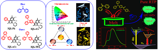 課題組與北京理工大學(xué)蔡政旭教授合作,進(jìn)一步設(shè)計以廉價的BPO為主體分子,以3,6-二甲基-7-氰基-1-氨基-8-烷氧基異喹啉類化合物為客體分子,成功地制備了一類具有優(yōu)異室溫磷光性質(zhì)的有機(jī)主客體摻雜室溫磷光體系(Scheme 16)。研究發(fā)現(xiàn)強(qiáng)的磷光強(qiáng)度使摻雜材料的穩(wěn)態(tài)發(fā)射表現(xiàn)出熒光、磷光雙重發(fā)光性質(zhì)。并且發(fā)現(xiàn)客體分子的烷氧基鏈長和濃度可以用于控制雙發(fā)射的相對強(qiáng)度,調(diào)節(jié)穩(wěn)態(tài)發(fā)射的顏色和磷光的強(qiáng)度。由于所述主體分子具有較低的熔點和良好的結(jié)晶性,所得的摻雜材料可以用作高級防偽的安全油墨(Chem. Eur. J. 2020, 26, 17376-17380)。進(jìn)一步以4位連有苯環(huán)、三苯胺和9-苯基-9H-咔唑的3,6-二甲基-7-氰基-1-氨基-8-甲氧基異喹啉類衍生物為客體分子,開發(fā)了一系列具有青色熒光和橙色室溫磷光雙重發(fā)光的有機(jī)摻雜材料(Scheme 17)。這種雙重發(fā)光可以組合成幾乎純白色的穩(wěn)態(tài)發(fā)光。重要的是,研究發(fā)現(xiàn)熒光、磷光發(fā)射的相對強(qiáng)度可以通過改變激發(fā)波長來調(diào)節(jié),因此也可以通過調(diào)節(jié)激發(fā)波長容易地實現(xiàn)三色發(fā)射開關(guān)(J. Phys. Chem. Lett. 2021, 12, 1814-1821)。進(jìn)一步以四種D-A型1-(4-(二苯胺基)苯基)-2-苯基-1-乙酮衍生物PAPO-H、PAPO-F、PAPO-Cl和PAPO-Br為客體分子開發(fā)了一系列有機(jī)摻雜室溫磷光材料(Scheme 18),發(fā)現(xiàn)隨著鹵素原子質(zhì)量的增加,客體和摻雜材料的磷光強(qiáng)度逐漸增大,且摻雜材料的最高磷光量子可達(dá)64%。更重要的是,該摻雜體系具有純磷光發(fā)射特性,表明體系中的激子具有很高的系間穿越能力。此外,研究也發(fā)現(xiàn)可以通過改變激發(fā)波長來調(diào)節(jié)激子的系間穿越效率,控制摻雜材料的發(fā)射顏色,使其發(fā)射綠色的磷光或青色的熒光。這一研究結(jié)果為新一代室溫磷光材料的設(shè)計提供了很有價值的參考(J. Mater. Chem. C 2021, DOI: 10.1039/d1tc00403d)。