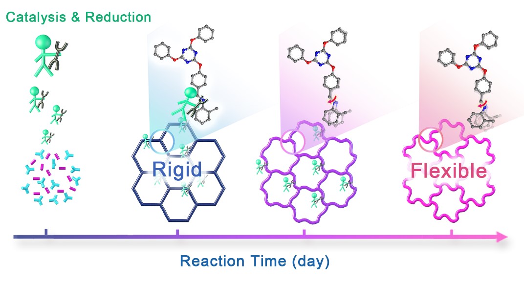 作為一類新興的具有規(guī)則孔道的晶態(tài)多孔材料,共價(jià)有機(jī)框架材料(COFs)近年來受到研究者們廣泛的關(guān)注。已報(bào)道的COFs大多采用剛性的亞胺鍵連接,且超過80%的亞胺鍵COFs在合成中使用乙酸作為催化劑。但在實(shí)際應(yīng)用中,乙酸催化得到的剛性C=N鍵連接的COFs由于具有比較固定的結(jié)構(gòu)和孔道尺寸,有時(shí)會(huì)限制材料中活性位點(diǎn)和功能基團(tuán)優(yōu)勢的充分發(fā)揮。為此,已有一些柔性COFs被研究和報(bào)道,其結(jié)構(gòu)相比于剛性COFs具有一定的彈性和自適應(yīng)性特點(diǎn),可隨客體分子的進(jìn)入發(fā)生動(dòng)態(tài)變化,有助于其應(yīng)用性能的提高。但由于構(gòu)建柔性COFs的單體模塊在空間上的靈活多變和可扭轉(zhuǎn)性,柔性結(jié)構(gòu)框架的搭建通常是比較困難的。結(jié)構(gòu)框架的柔性增加也會(huì)使材料的晶形變差,甚至導(dǎo)致無規(guī)聚合物的生成。