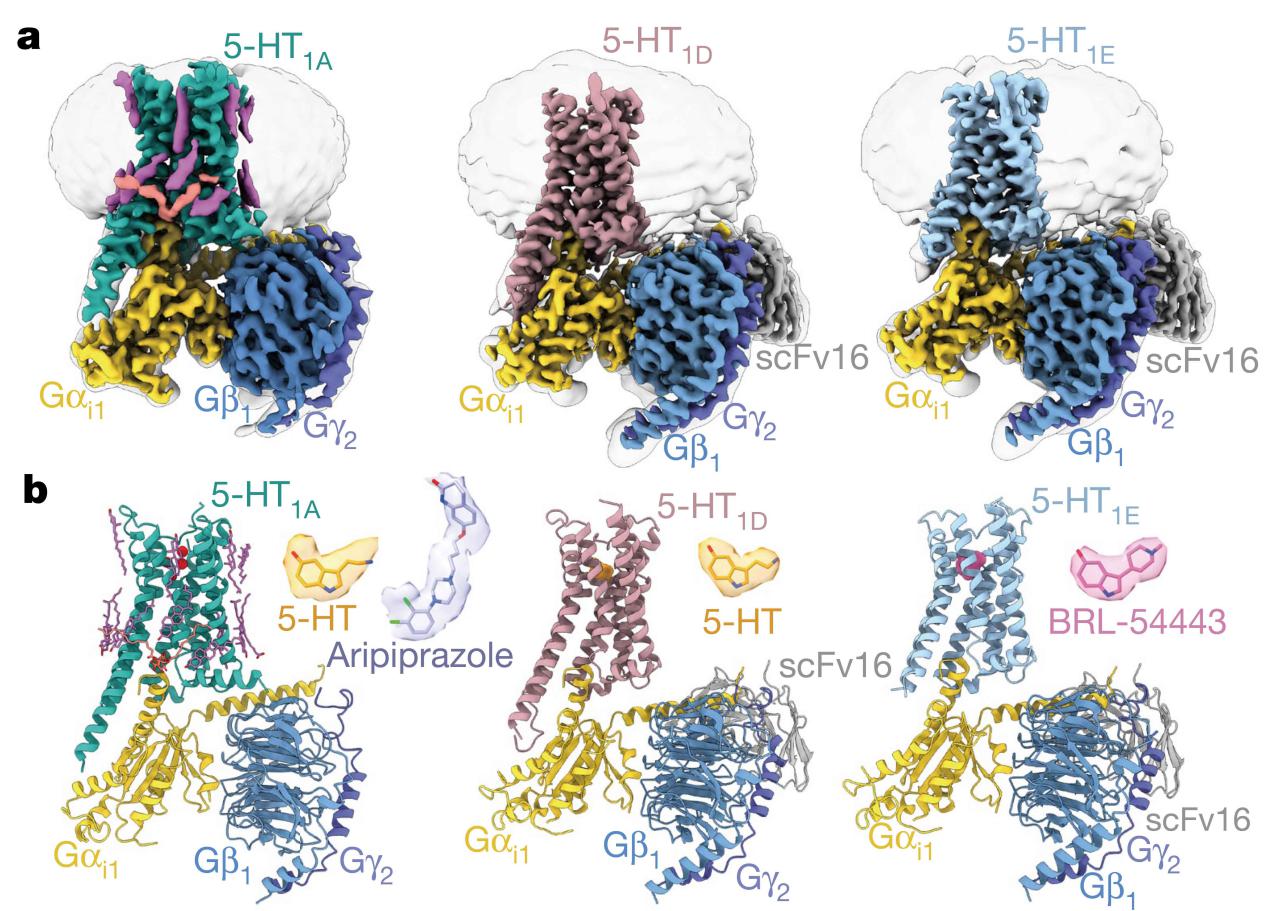 圖1 5-HT1A、5-HT1D和5-HT1e受體與配體和Gi蛋白復(fù)合物的冷凍電鏡結(jié)構(gòu)