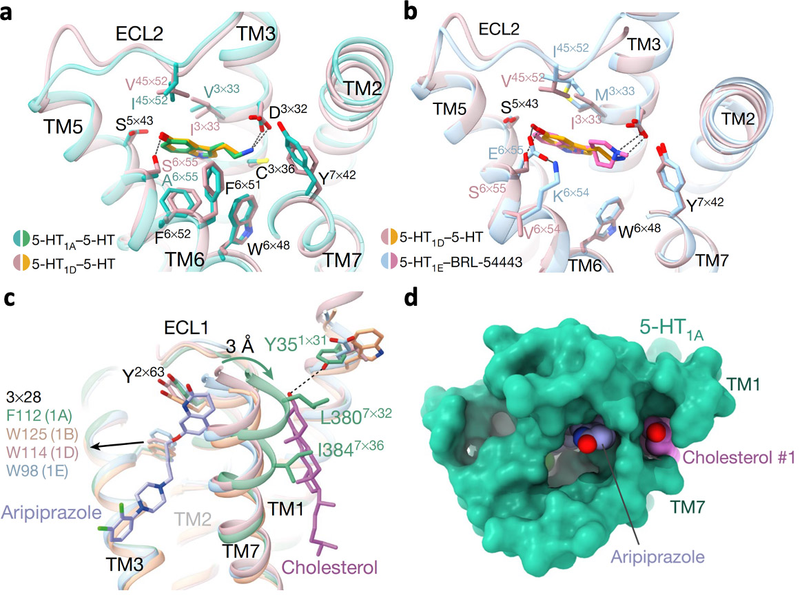 已有的研究發(fā)現(xiàn),血清素與其受體結(jié)合能夠產(chǎn)生幸福感,使人遠(yuǎn)離焦慮。血清素受體1A是臨床藥物靶向最為集中的受體亞型,是臨床治療精神分裂和抑郁癥的藥物阿立哌唑的主要藥物靶標(biāo)。血清素受體1D與血清素受體1B具有高度序列同源性,同時(shí)也是曲坦類抗偏頭痛藥物的作用靶標(biāo);血清素受體1E與記憶有關(guān)。此外,即使大腦沒(méi)有分泌血清素來(lái)激活其受體,人體也會(huì)保持一定的幸福感。