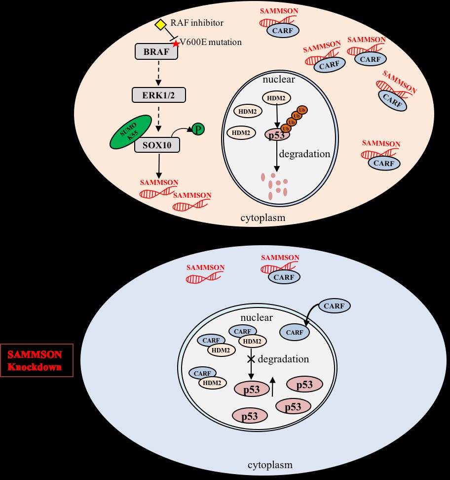 研究發(fā)現(xiàn),在攜帶BRAF激酶突變的黑色素瘤中,RAF抑制劑能迅速誘導(dǎo)SAMMSON表達上調(diào),促進黑色素瘤細胞對RAF抑制劑的適應(yīng)性耐受。轉(zhuǎn)錄因子SOX10介導(dǎo)了RAF抑制劑誘導(dǎo)的SAMMSON上調(diào),而SOX10位于K55位點的SUMO化修飾對這一功能具有重要的作用。進一步研究發(fā)現(xiàn)敲低SAMMSON通過促進CARF入核抑制p53蛋白降解,進而提高p53蛋白表達,激活p53/p21信號通路。此外,研究人員通過體內(nèi)裸鼠成瘤實驗和體外細胞凋亡檢測實驗發(fā)現(xiàn),敲低SAMMSON的表達可以顯著增加黑色素瘤細胞對RAF激酶抑制劑的敏感性,而SAMMSON和CARF同時敲低能有效地拮抗單獨敲低SAMMSON引起的細胞凋亡和腫瘤抑制作用。因此本研究揭示了SAMMSON/CARF/p53信號軸參與調(diào)控BRAF突變黑色素瘤細胞對RAF抑制劑的適應(yīng)性耐藥這一新機制。