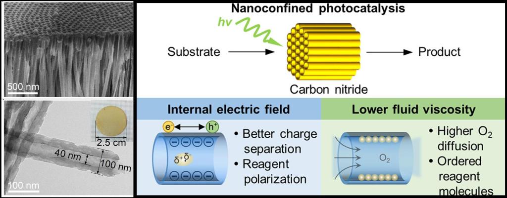 近日,西安交通大學(xué)電氣學(xué)院、電力設(shè)備電氣絕緣國家重點實驗室新型儲能與能量轉(zhuǎn)換納米材料研究中心石建穩(wěn)副教授團隊與德國馬普膠體與界面研究所Aleksandr Savateev博士及中科院理化所江雷院士合作,利用石墨相氮化碳(g-C3N4)納米管膜的一維限域孔道實現(xiàn)了高效光催化過程,證明了納米限域微環(huán)境在調(diào)控催化性能上的重要作用。