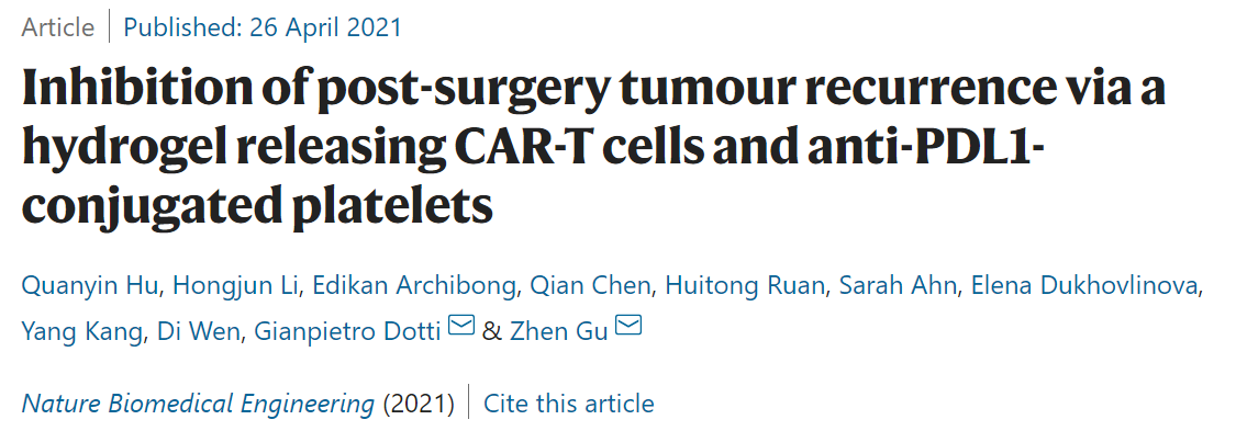 本研究通過(guò)一種“細(xì)胞倉(cāng)庫(kù)緩控釋”的遞送策略,將CAR-T細(xì)胞和抗PD-L1抗體連接的血小板裝載在水凝膠中,通過(guò)緩慢釋放CAR-T細(xì)胞并阻斷免疫檢查點(diǎn)通路提升CAR-T細(xì)胞對(duì)腫瘤的殺傷力,對(duì)抑制術(shù)后癌癥復(fù)發(fā)起到了良好的治療效果。顧臻教授及研究人員指出,一方面這還可以和其他療法(例如化療放療)聯(lián)合使用,更好的抑制腫瘤復(fù)發(fā)和轉(zhuǎn)移;同時(shí),新型細(xì)胞遞送策略也為其他細(xì)胞療法和相關(guān)疾病的治療提供了新思路。