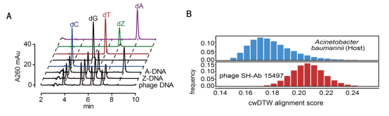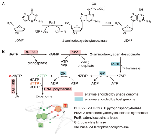 DNA是生命體的遺傳物質(zhì),決定生物的多樣性和特征。生命的遺傳信息存儲(chǔ)在由A、G、C、T四種堿基組成的DNA序列中。DNA四種堿基互補(bǔ)作用的雙螺旋結(jié)構(gòu)1953年由美國(guó)科學(xué)家沃特森和英國(guó)科學(xué)家克里克揭示,構(gòu)成生命中心法則的基礎(chǔ),二人因此獲得諾貝爾獎(jiǎng)。目前唯一的例外是1977年前蘇聯(lián)科學(xué)家在感染藍(lán)細(xì)菌的一株噬菌體中發(fā)現(xiàn)由Z、G、C、T組成的DNA。這類(lèi)特殊DNA用二氨基嘌呤(Z)完全取代正常的腺嘌呤(A),與胸腺嘧啶(T)配對(duì),形成更穩(wěn)定的三個(gè)氫鍵,極大地改變了DNA的物理化學(xué)特征,然而這類(lèi)特殊DNA的合成機(jī)制及普遍性一直未解。以上研究團(tuán)隊(duì)找到了催化這一特殊DNA合成的多個(gè)酶,不僅涉及Z的合成,還包括A的消除。盡管DNA測(cè)序非常普及,但由于普通DNA測(cè)序手段并不能發(fā)現(xiàn)Z的存在,該團(tuán)隊(duì)利用酶水解DNA再進(jìn)行組分分析的傳統(tǒng)方法,證實(shí)了地球上廣泛存在含這類(lèi)特殊DNA的噬菌體,并用最新一代的納米孔DNA測(cè)序技術(shù),對(duì)結(jié)果進(jìn)行了進(jìn)一步驗(yàn)證。