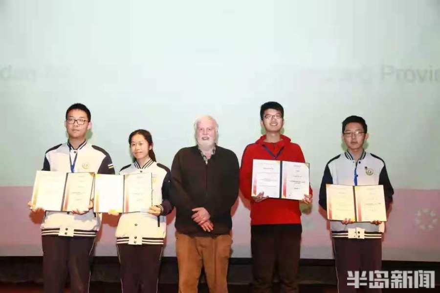 2019年,英國皇家化學(xué)學(xué)會主辦的化學(xué)競賽中,李原寧(右一)是青島二中代表隊隊長,帶領(lǐng)團體獲得亞軍。