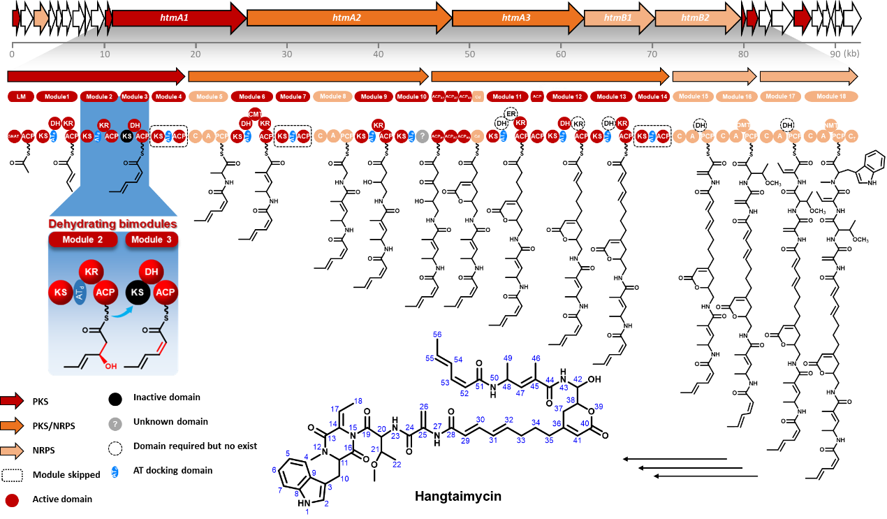 孫宇輝教授課題組前期在微生物活性天然產(chǎn)物的挖掘過程中,從武漢大學(xué)校園土壤中分離到的一株鏈霉菌(Streptomyces spectabilis CCTCC M2017417)中發(fā)現(xiàn)了一類具有抗耐甲氧西林金黃色葡萄球菌(Methicillin-resistant Staphylococcus aureus, MRSA)活性的萘安莎類抗生素曲張鏈絲菌素(Streptovaricins),并對參與曲張鏈絲菌素的多個細(xì)胞色素P450酶編碼基因進(jìn)行了全面探索(ACS Chemical Biology, 2017, 12: 2589-2597),揭示了與其中亞甲基雙氧橋結(jié)構(gòu)相關(guān)的生物合成機(jī)制(Nature Communications, 2020, 11: 4501)。在對這一菌株活性次生代謝產(chǎn)物的進(jìn)一步挖掘過程中,重新分離獲得了媲美一線抗肝損傷臨床藥物水飛薊素的活性先導(dǎo)化合物Hangtaimycin,并糾正了其立體化學(xué)構(gòu)型。通過對Hangtaimycin的結(jié)構(gòu)及其生物合成基因簇生物信息學(xué)分析,發(fā)現(xiàn)Hangtaimycin的碳骨架化學(xué)結(jié)構(gòu)與催化其生物合成的PKS結(jié)構(gòu)域(Domain)功能之間存在非經(jīng)典線性對應(yīng),其中HtmA1中四個模塊(Module)僅負(fù)責(zé)催化兩輪碳鏈延伸。通過與Jeroen S. Dickschat教授課題組,以及藥學(xué)院沈坤副研究員、項瑾副教授團(tuán)隊合作,運(yùn)用體內(nèi)遺傳失活、底物化學(xué)合成及體外生化重建等方法,證明模塊1僅負(fù)責(zé)一個不飽和雙鍵單元的延伸,模塊2模塊3以非典型共線性脫水雙模塊的方式,共同催化第二個Z型雙鍵的形成。