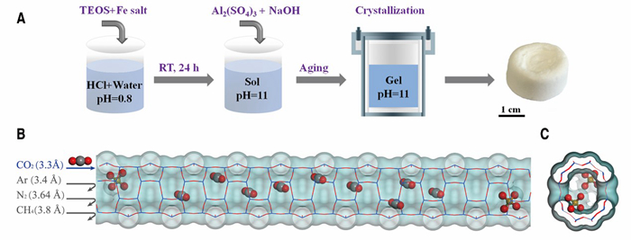 針對(duì)這一難題,王軍教授團(tuán)隊(duì)開(kāi)發(fā)了雜原子沸石分子篩水熱合成新路線,合成出結(jié)構(gòu)獨(dú)特的含鐵雜原子絲光沸石分子篩單塊材料,無(wú)需任何后處理即可直接作為自成型物理吸附劑,表現(xiàn)出迄今為止最高的CO2體積吸附容量和分離效率,對(duì)氬氣(Ar),氮?dú)猓∟2)以及甲烷(CH4)表現(xiàn)出良好的分子篩分能力,具有優(yōu)異的抗水汽性能,實(shí)現(xiàn)了對(duì)燃燒后(CO2和N2分離)、沼氣以及天然氣純化(CO2和CH4分離)等體系中CO2的高效吸附分離。審稿人評(píng)價(jià),這一研究是碳捕集領(lǐng)域的重大突破,具有明顯的實(shí)際應(yīng)用潛力,開(kāi)拓了雜原子沸石分子篩在氣體吸附分離領(lǐng)域的新應(yīng)用。