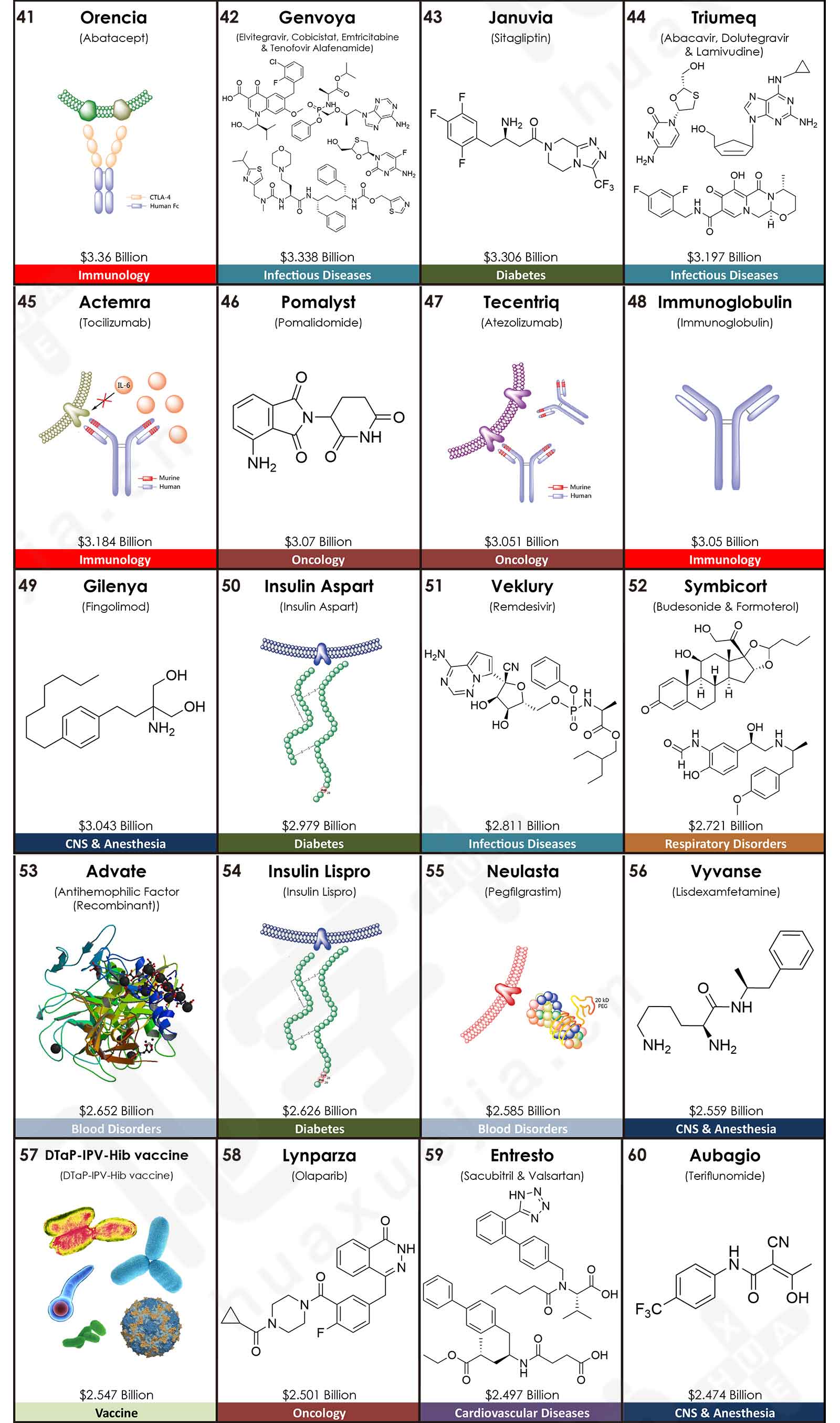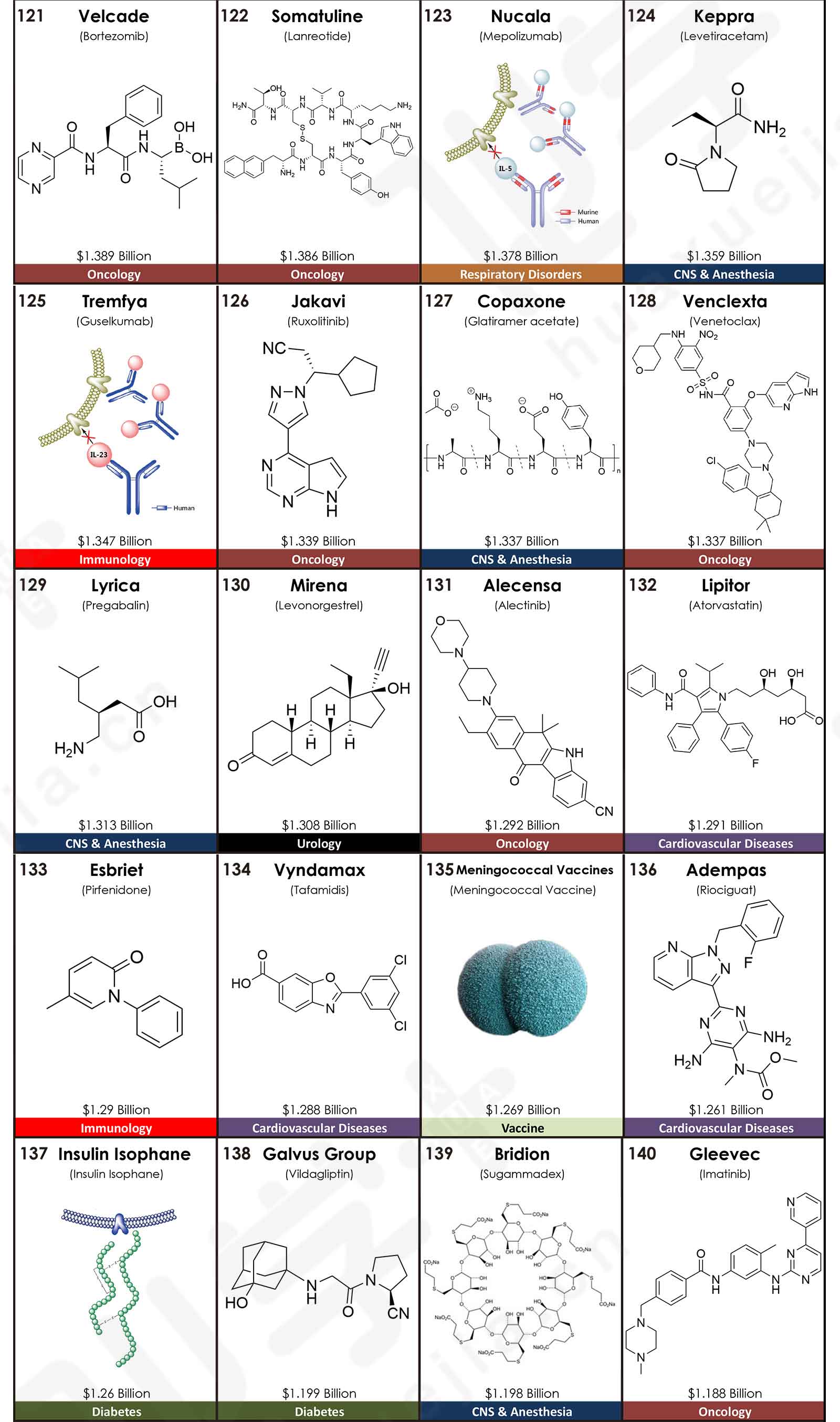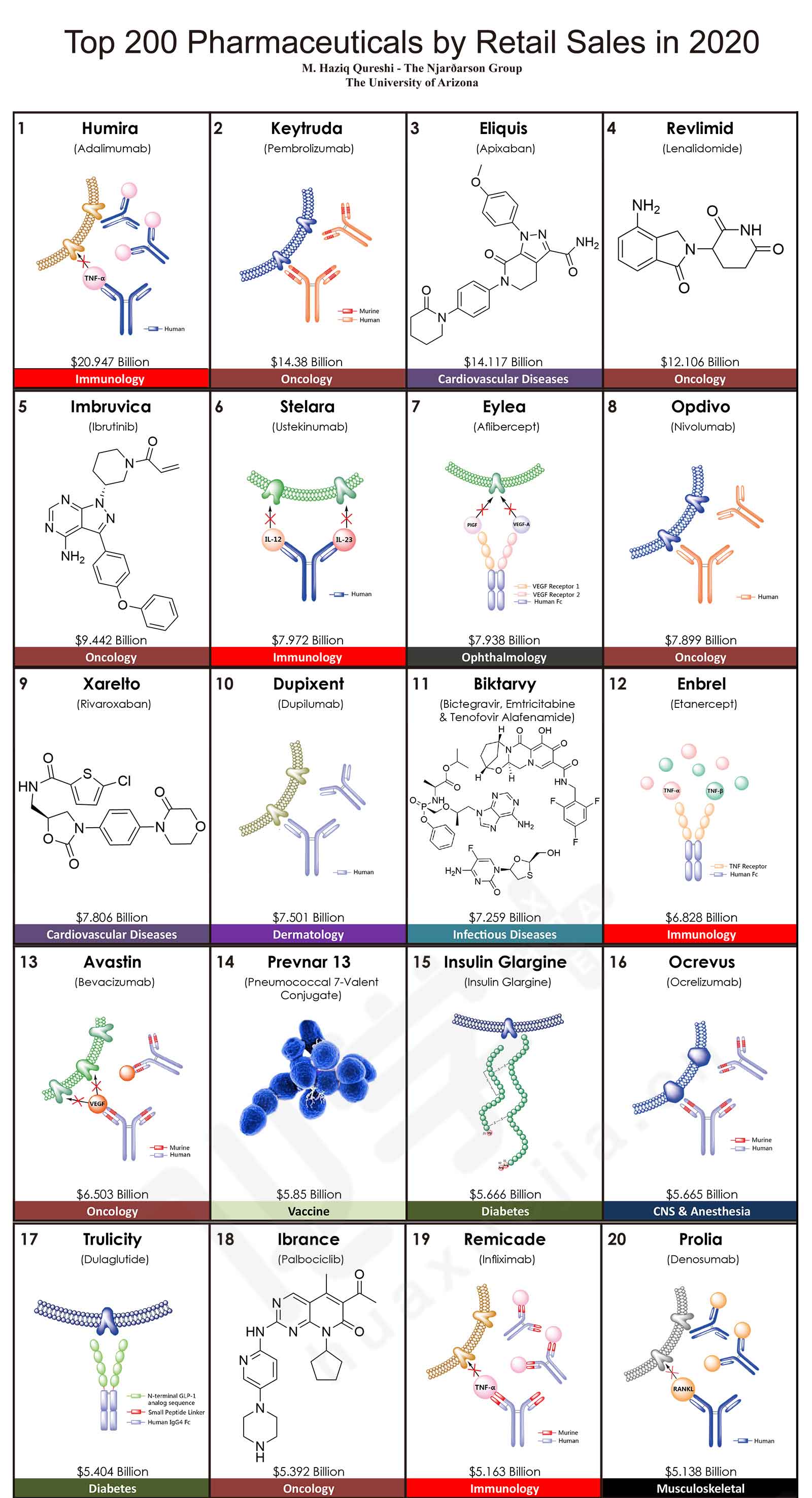 來自美國亞利桑那大學(xué)Njardarson研究團(tuán)隊(duì)發(fā)布了2020年全球銷售額TOP200藥物排行榜,200款產(chǎn)品的合計(jì)銷售額高達(dá)4996.28億美元。其中,最暢銷的TOP5藥物分別是:Humira(阿達(dá)木單抗),銷售額是209.47億美元;Keytruda(派姆單抗),銷售額是143.80億美元;抗凝血藥物Eliquis(阿哌沙班),銷售額是141.17億美元;Revlimid(來那度胺),銷售額是121.06億美元;Imbruvica(伊布替尼),銷售額是94.42億美元。這五款藥品在2019年同樣位于前五,2020年的銷售額均比上一年有較大幅度的增長,同比增長率分別為:6.2%、29.7%、16.2%、29.1%和16.8%。其中,Keytruda在2019年的排名為第三,2020年上升一位;而Eliquis在2019年的排名為第二,2020年下滑一位。