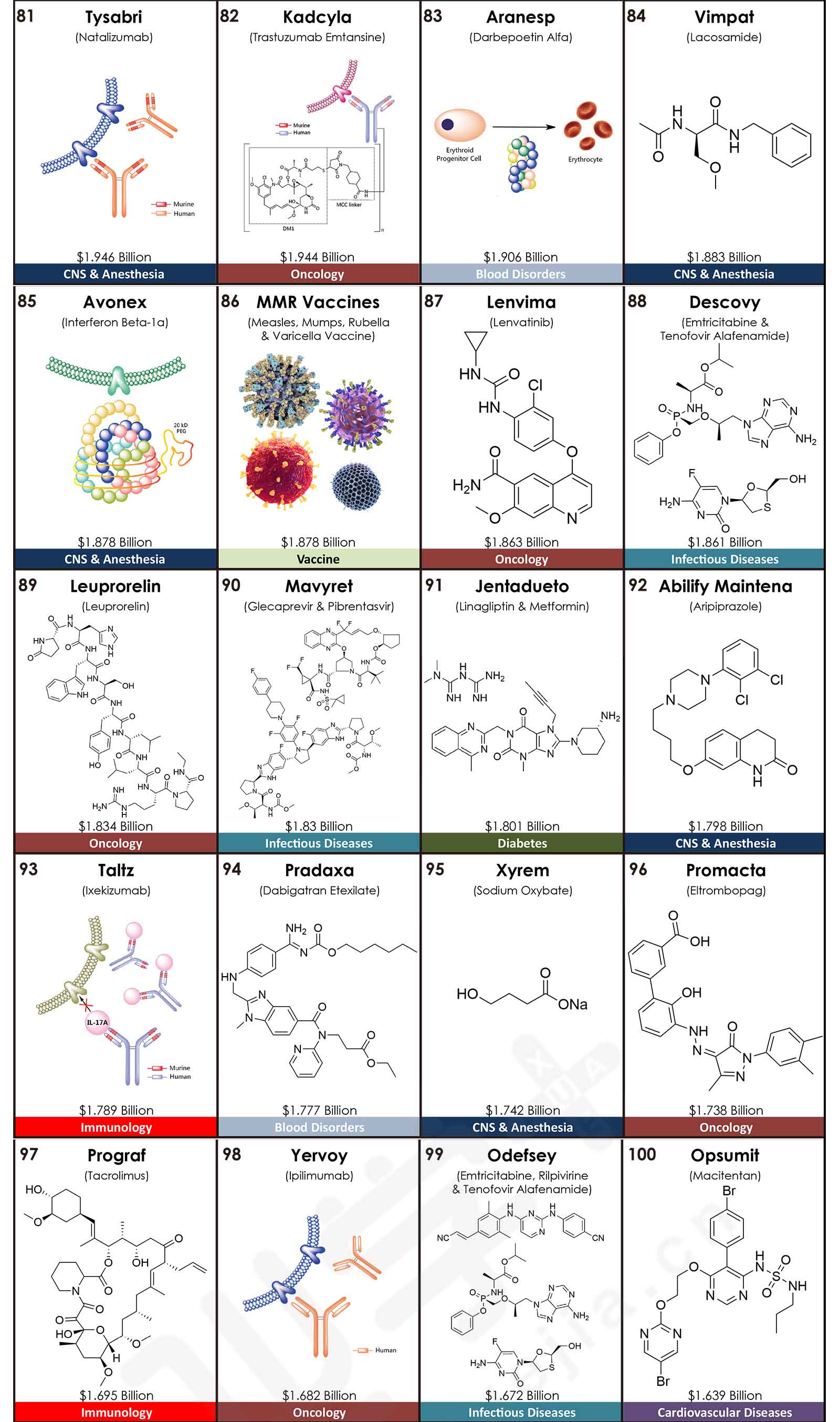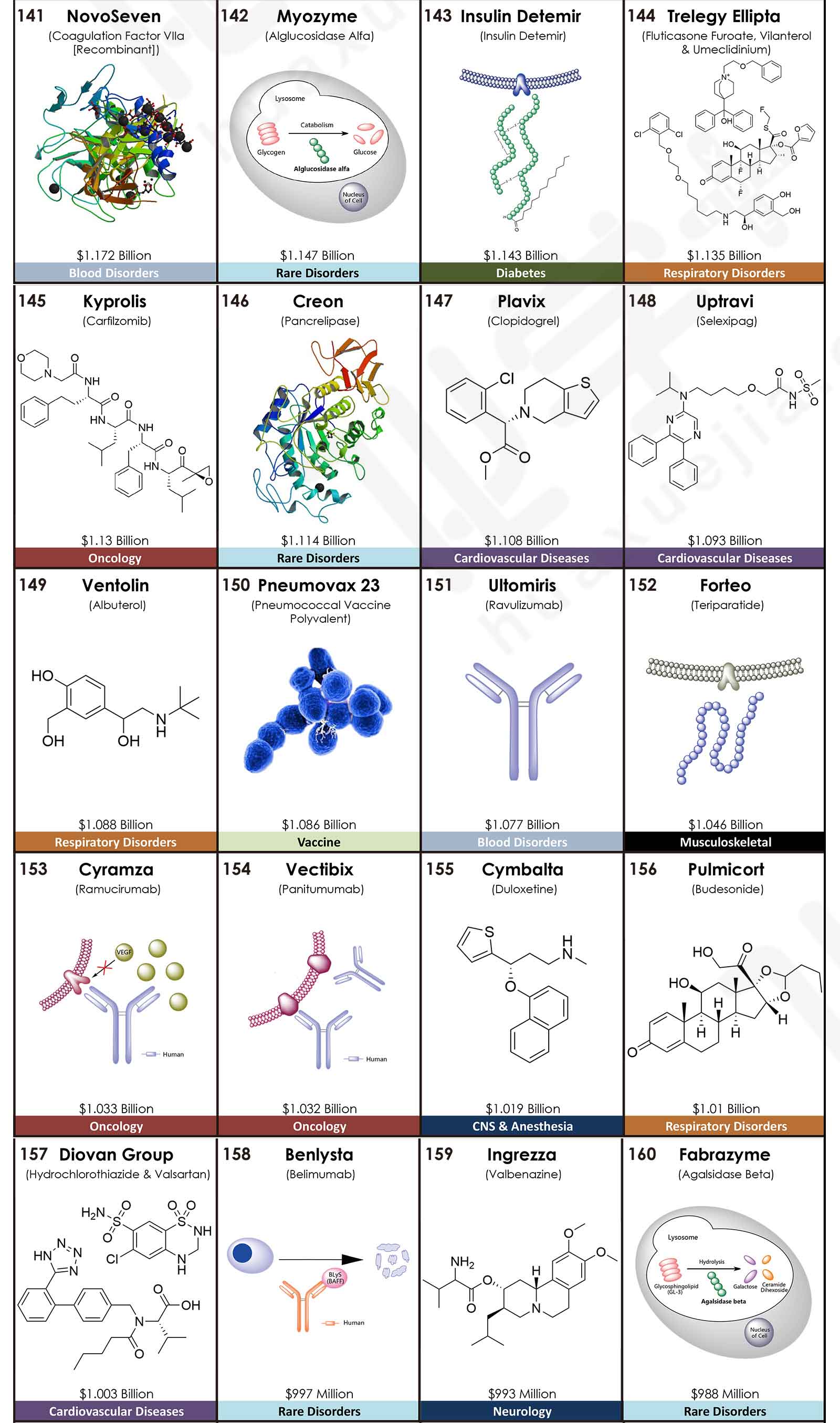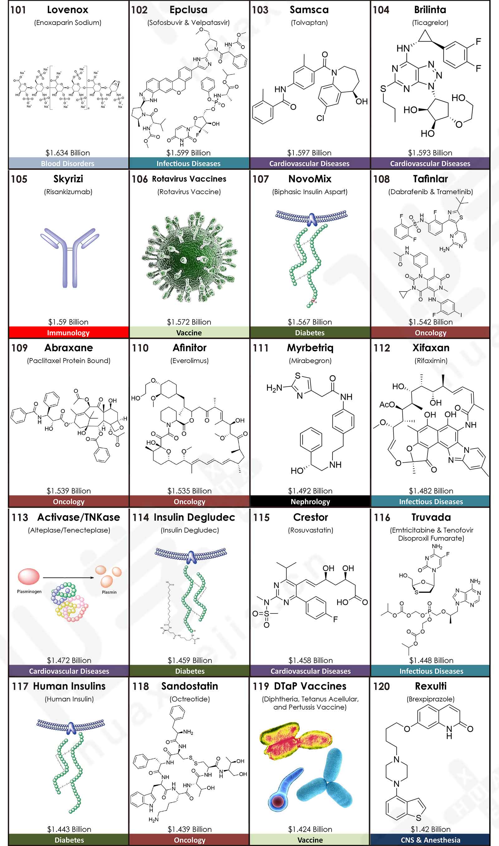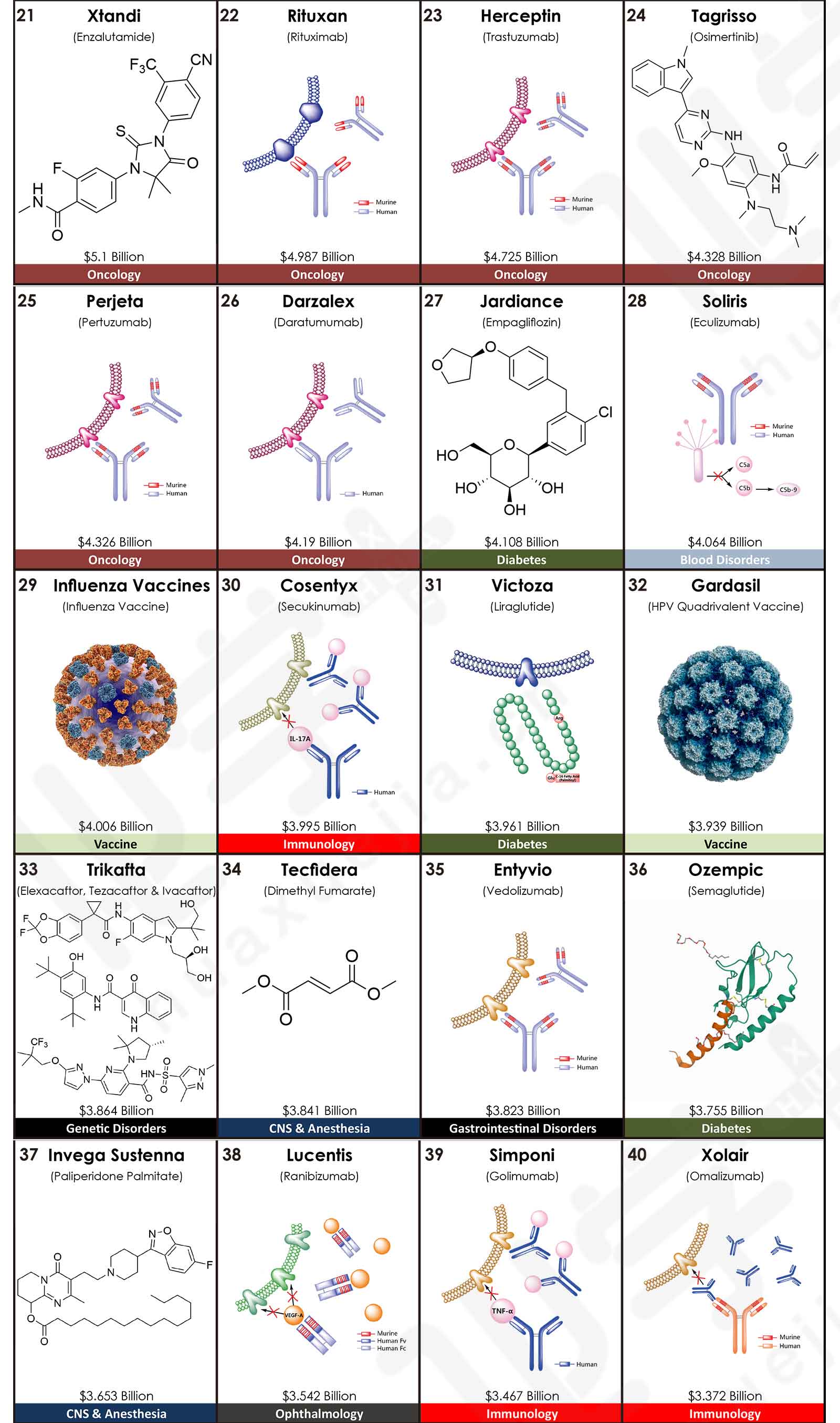 來自美國亞利桑那大學(xué)Njardarson研究團(tuán)隊(duì)發(fā)布了2020年全球銷售額TOP200藥物排行榜,200款產(chǎn)品的合計(jì)銷售額高達(dá)4996.28億美元。其中,最暢銷的TOP5藥物分別是:Humira(阿達(dá)木單抗),銷售額是209.47億美元;Keytruda(派姆單抗),銷售額是143.80億美元;抗凝血藥物Eliquis(阿哌沙班),銷售額是141.17億美元;Revlimid(來那度胺),銷售額是121.06億美元;Imbruvica(伊布替尼),銷售額是94.42億美元。這五款藥品在2019年同樣位于前五,2020年的銷售額均比上一年有較大幅度的增長,同比增長率分別為:6.2%、29.7%、16.2%、29.1%和16.8%。其中,Keytruda在2019年的排名為第三,2020年上升一位;而Eliquis在2019年的排名為第二,2020年下滑一位。