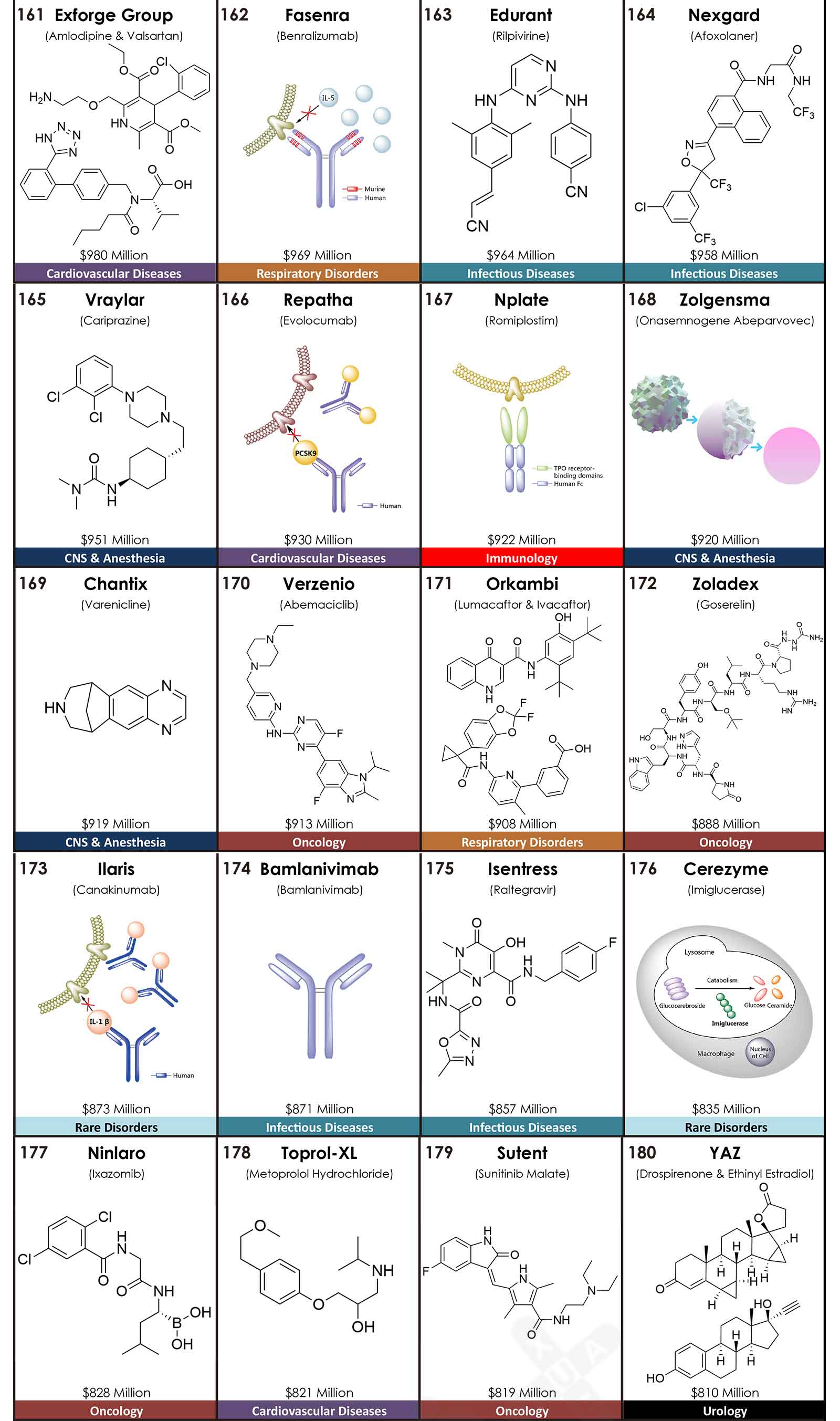 CNS&麻醉的上榜藥物有22個(gè),較2019年增長2個(gè),并從2019年的第四位躍至2020年的第二位;銷售額為436.81億美元,排名第三,同比增長8.8%。