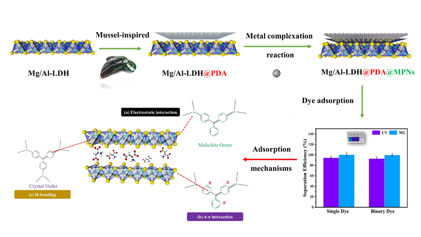 研究表明貽貝具有驚人的粘附性能和機(jī)械性能,這種超強(qiáng)粘彈性主要源于足腺分泌的粘蛋白(含有10%的3,4-二羥基苯丙氨酸DOPA,類兒茶酚結(jié)構(gòu)基團(tuán))與三價鐵離子(Fe3+)通過化學(xué)配位和共價交聯(lián)作用形成的高分子網(wǎng)狀彈性聚合物。受此啟發(fā),研究團(tuán)隊通過自氧化聚合將多巴胺(DA)均勻修飾在二維層狀雙金屬氫氧化物(LDH)表面,形成聚多巴胺仿生界面(LDH@PDA);利用含兒茶酚基團(tuán)的單寧酸(TA)與Fe3+的金屬-有機(jī)絡(luò)合反應(yīng),在LDH@PDA上錨定具有多孔結(jié)構(gòu)的金屬-多酚網(wǎng)絡(luò)(MPNs),借助PDA和MPNs的界面協(xié)同互作,賦予材料更多表面活性位點(diǎn),進(jìn)而提升其粘附和吸附特性。