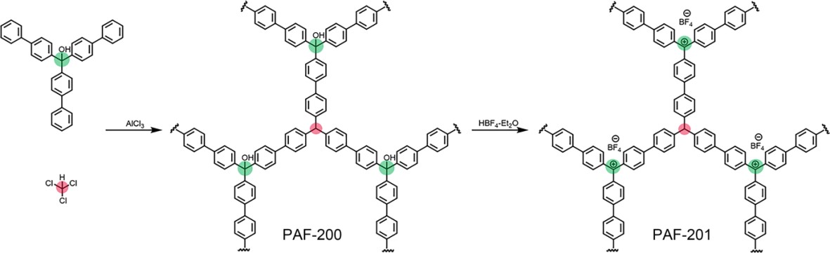 三苯甲基碳正離子鹽已經(jīng)作為路易斯酸催化劑和氧化劑在有機(jī)合成中使用多年。但由于其價(jià)格較貴和回收困難,其應(yīng)用一直受到限制。針對(duì)此問(wèn)題,卞證教授和朱廣山教授等以三聯(lián)苯甲醇和氯仿為底物,通過(guò)Friedel-Crafts烷基化反應(yīng)合成了基于三苯甲醇的多孔芳香骨架PAF-200,并在四氟硼酸作用下,獲得主要基于三苯甲基碳正離子的多孔芳香骨架PAF-201(圖1),期望其具有小分子碳正離子性質(zhì)且易回收使用。