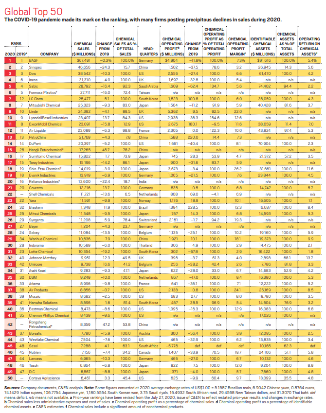 盡管去年的數(shù)據(jù)波動很大,但上榜企業(yè)變化不大,擁有大量石化業(yè)務(wù)的公司普遍出現(xiàn)銷售下滑,排名也有所下降。制造工業(yè)氣體或農(nóng)用化學(xué)品的公司上升明顯。